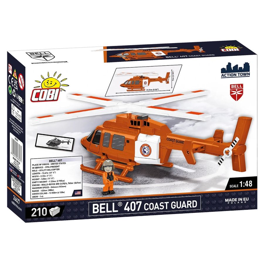 The Bell 407 - Coast Guard model complements the refreshed ACTION TOWN collection from COBI! The Bell 407 Coast Guard is a machine that combines reliability, speed, efficiency and maneuverability, allowing for the effective performance of various operations, such as rescuing survivors, patrolling the coast or monitoring maritime areas. Now you have the chance to feel like a real engineer and build a helicopter that plays such an important role in operations on waters around the world. The 1:48 scale set allows you to create a model of a multi-purpose helicopter used by the Coast Guard to carry out rescue missions. With the help of intuitive instructions, building fans of all ages will be able to easily create this amazing model. The helicopter model consists of 210 elements that provide exceptional authenticity and they reproduce the functionality of the machine used by the Coast Guard. Thanks to photo-realistic details and new elements, such as the cockpit specially designed for this set, the Bell 407 Coast Guard will be a real gem in any collection. Check and search for other vehicles from the ACTION TOWN series from COBI and create your own collection of exciting machines! Features; - 210 high-quality elements - Manufactured in the EU by a company with over 35 years of tradition - The blocks meet the safety standards of products for children - Fully compatible with other brands of construction blocks - Blocks with prints do not scratch or smear and do not fade during play or under the influence of temperature - Clear and intuitive instructions based on illustrations and step-by-step directions Model dimensions: 22.5 × 7 x 16.5 cm