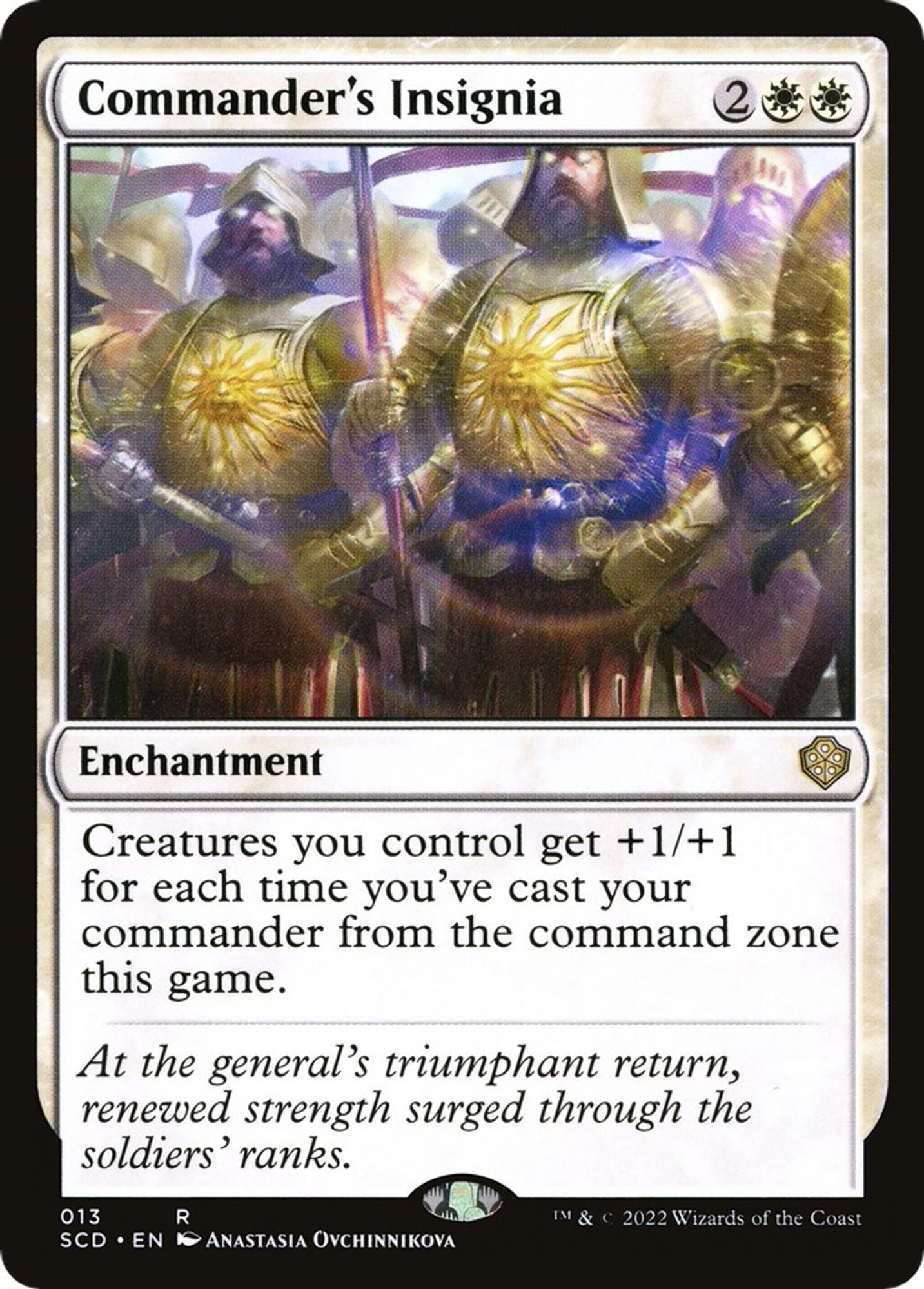 - Description: Creatures you control get +1/+1 for each time you’ve cast your commander from the command zone this game.