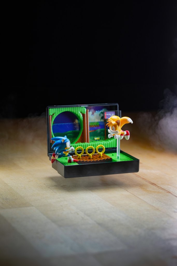 - Includes 1.5-inch mini-figures of Sonic and Tails; Sonic pegs into the scene, Tails is mounted on a clear flight stand.