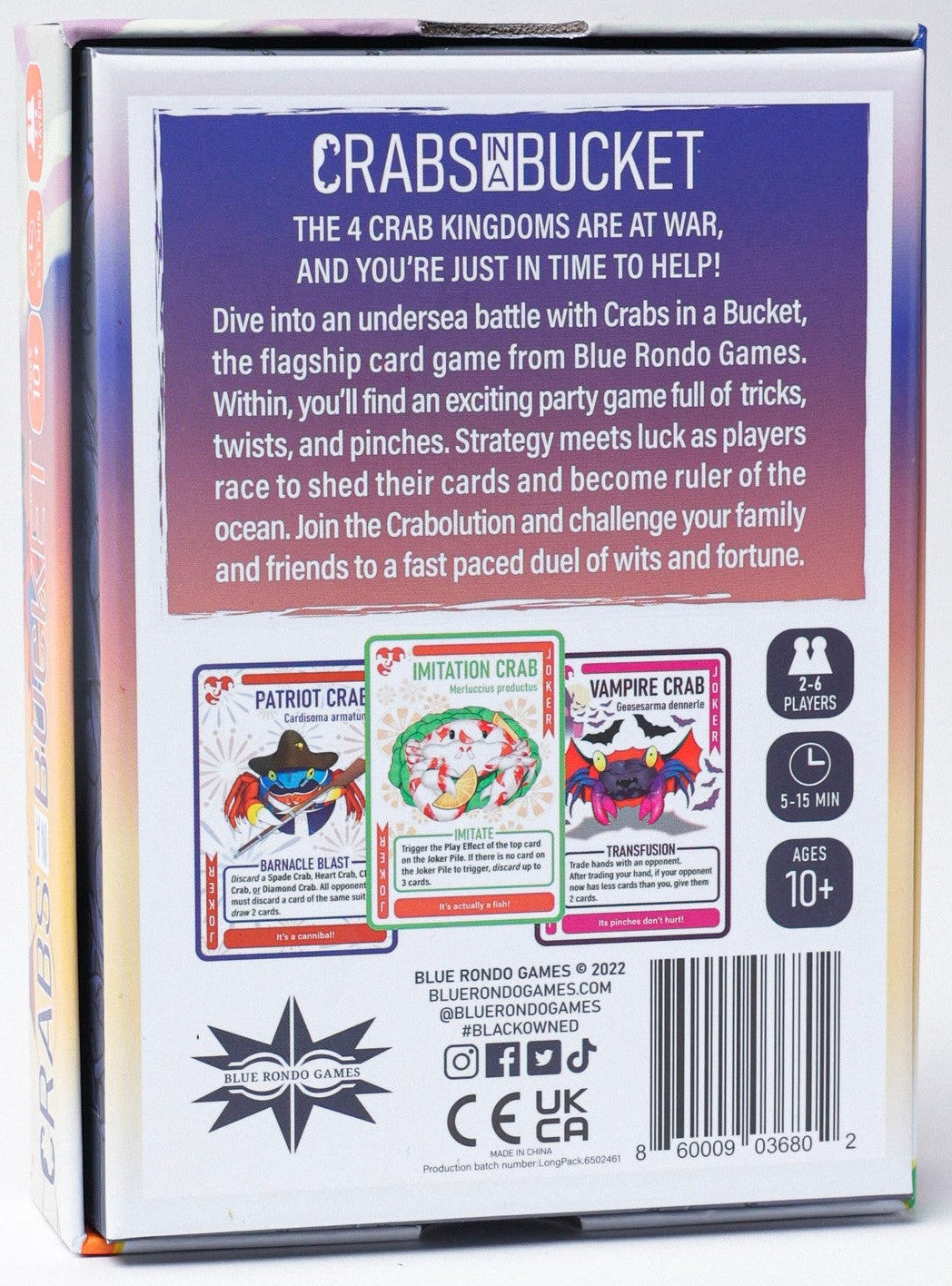 Crabs in a Bucket is a fast-paced shedding type card game for 2-6 players that blends luck, strategy, and a cast of colorful crab characters. The goal of the game is to be the first player to play or discard their entire hand.