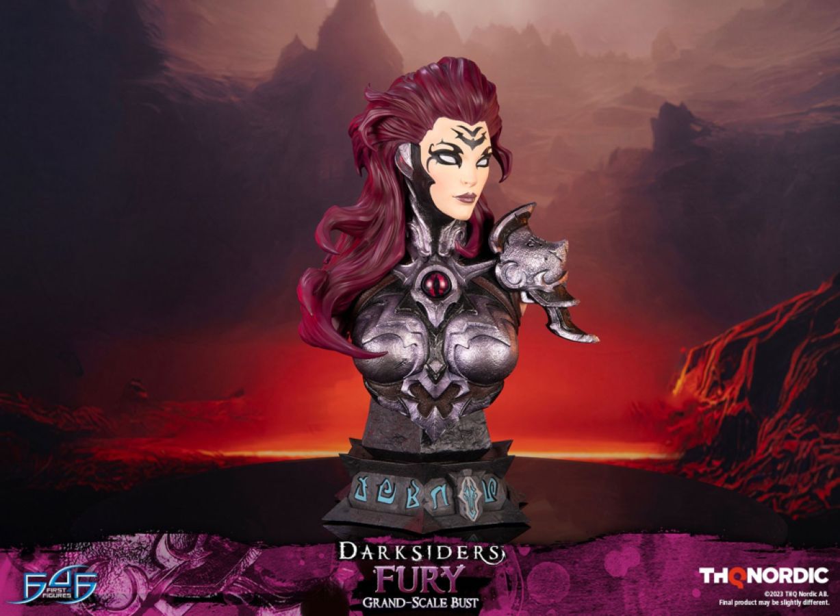 First 4 Figures proudly presents the Grand Scale Bust of Fury, one of the four Horsemen of the Apocalypse from the hit video game series, Darksiders. Fury is a formidable and fiery warrior, wielding a whip and powerful magic with unparalleled skill. Her dedication and ferocity make her a fearsome force in the eternal conflict between Heaven and Hell. In this Grand Scale Bust, Furys head and upper torso are recreated in exquisite detail. The bust is made to be appreciated at any distance. When viewed from afar, Furys silhouette, with her long, flowing hair and fitted suit of armor, is as imposing as she appears in the game. Up close, the incredible sculpting and painting bring Fury to life with realistic details. The Fury Grand Scale Bust looks amazing from any angle, and the manually rotating base allows collectors to show off Fury however they choose. The base also includes runic inscriptions from the mysterious Void Between Worlds, a location featured throughout the Darksiders series. Darksiders - Fury Grand Scale Bust includes: - Lifelike Bust of Fury - Ultra-Realistic Upper Torso and Head - Manually Rotating Base with Runic Inscriptions - Limited Edition Numbering - Authentication Card