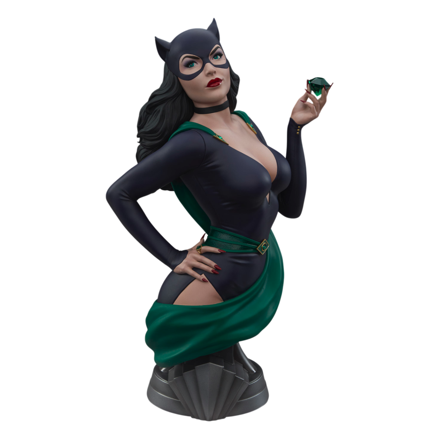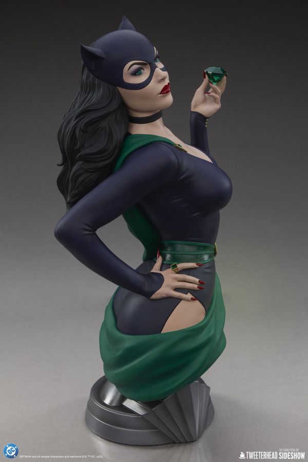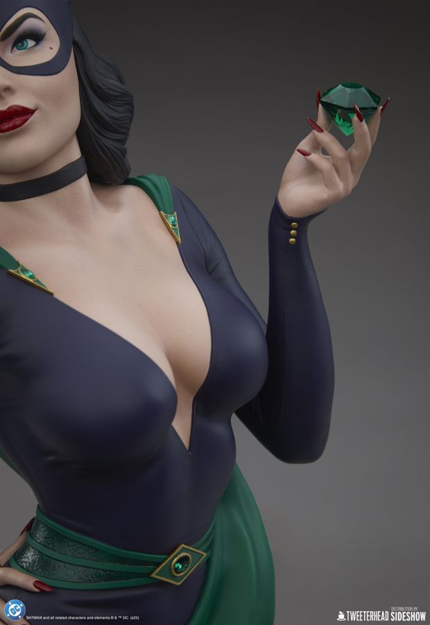 "I'll stun Gotham City with such cat-crimes that they'll never ridicule Catwoman again!" Tweeterhead presents the Catwoman 1:3 Scale Bust, a stunning DC collectible worthy of the infamous cat burglar herself. The Catwoman 1:3 Scale Bust shows Selina Kyle in her classic costume, haughtily holding a heisted green gem. With one hand on her hip, she dares the World's Greatest Detective to come and catch her if he can - with feline grace and cat-itude, she'll run the jewels right out of Gotham. The Catwoman 1:3 Scale Bust measures 15.25" tall x 9.25" wide x 5.75" deep. This waist-up figure is fully sculpted and sits on a silver Art Deco-themed base evoking the signature architecture of Gotham City. Her classic purple bodysuit and cutout cat mask are accented by a green cape and sash. Catwoman's portrait boasts a confident expression, emphasized with bold red lips, a beauty mark on her cheek, and a flourish of eye makeup. Glittering glass gems are set in the feline cape pins, ring, and emblem on her belt, making Batman's cattiest rogue as lovely to behold as the treasures she steals. Sink your claws into something fabulous with the Catwoman 1:3 Scale Bust by Tweeterhead!