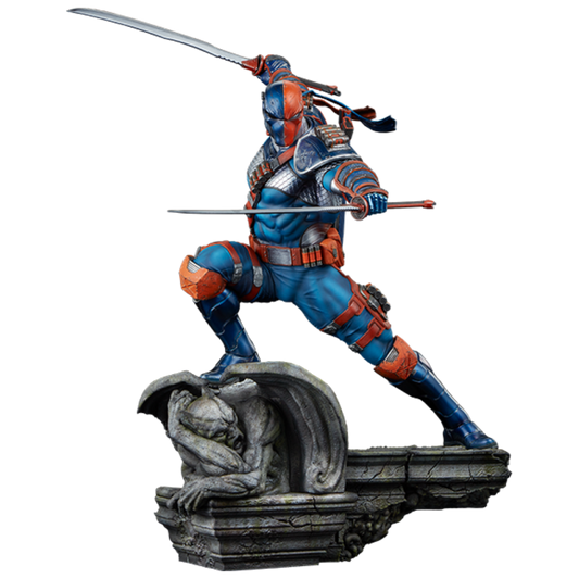 "You called me a villain. Never thought of myself as that. Im a mercenary, a soldier for hire." Sideshow presents the Deathstroke Premium Format Figure, a deadly DC Comics collectible inspired by the master assassins modern comic book appearances. The Deathstroke Premium Format Figure measures 24" tall x 16" wide x 21" deep as the villain stands triumphant over his foes, the Teen Titans. Wielding dual swords, Slade Wilson strikes an action stance, ready to hunt down his next targets with every lethal weapon in his arsenal. The stone-like rooftop base features a sculpted gargoyle bust and includes hidden reliefs of several defeated heroes within the architecture. Fans can uncover Teen Titans team members like Cyborg, Starfire, Raven, and more memorialized alongside other evidence of Deathstroke the Terminator's extensive hitlist. The Deathstroke Premium Format Figure captures his impressive physique and deadly weaponry with a detailed blue and orange armored costume. Silver scaled accents give an added defense to his powerful appearance, and his signature look is finished off with a two-toned mask. This fully sculpted polystone DC Comics statue has battle-worn markings like slashes, dents, and other signs of combat to further tell the story of his many mercenary assignments. Deathstroke makes a perfect companion for your favorite quarter-scale heroes and villains already at home in your DC Comics collection.