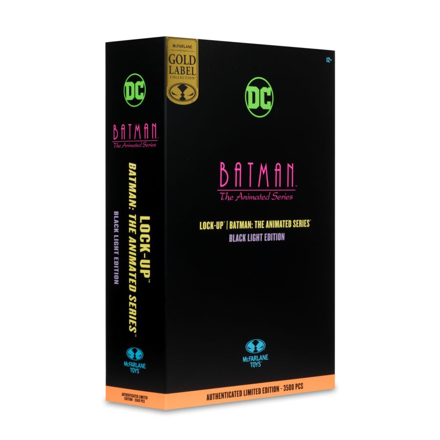 Lyle Bolton was expelled from the Police Academy and kicked out of various security jobs for brutality. Adopting the codename "Lock-Up," Bolton began capturing felons as a vigilante and taking out any police who got in his way. When his facility was discovered, Lock-Up tried to drown his prisoners, but was stopped by Batman, Robin, and Nightwing. Features: - Incredibly detailed 6" scale figure based on Batman: The Animated Series - Featured in black light glow deco - Accessories include baton, an exclusive card stand and a detailed black light base with two battery-powered black lights - Included collectible art card with character art on the front and certificate of authenticity on the back - Collect all McFarlane Toys DC Multiverse