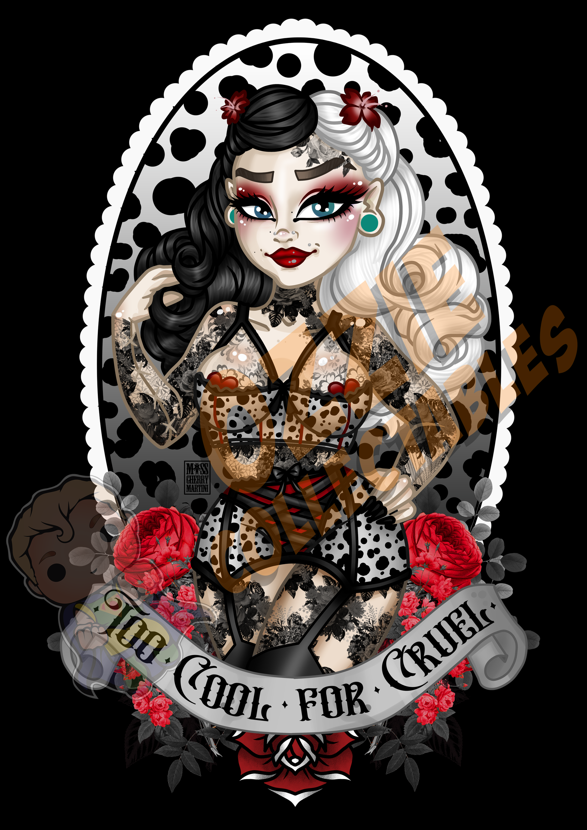 She's too cool for cruel. It's all about fashion, darling, and what better way to show off your style than with a unique print by Rose Demon? This gorgeous artwork features classic fashionista slash villain Cruella De Vil, reimagined in rockin' retro pin-up style complete with dalmatian printed lingerie. A cheeky gift for the Disney lover in your life, or hang her anywhere in your home that needs a gothic pop of dark magic!