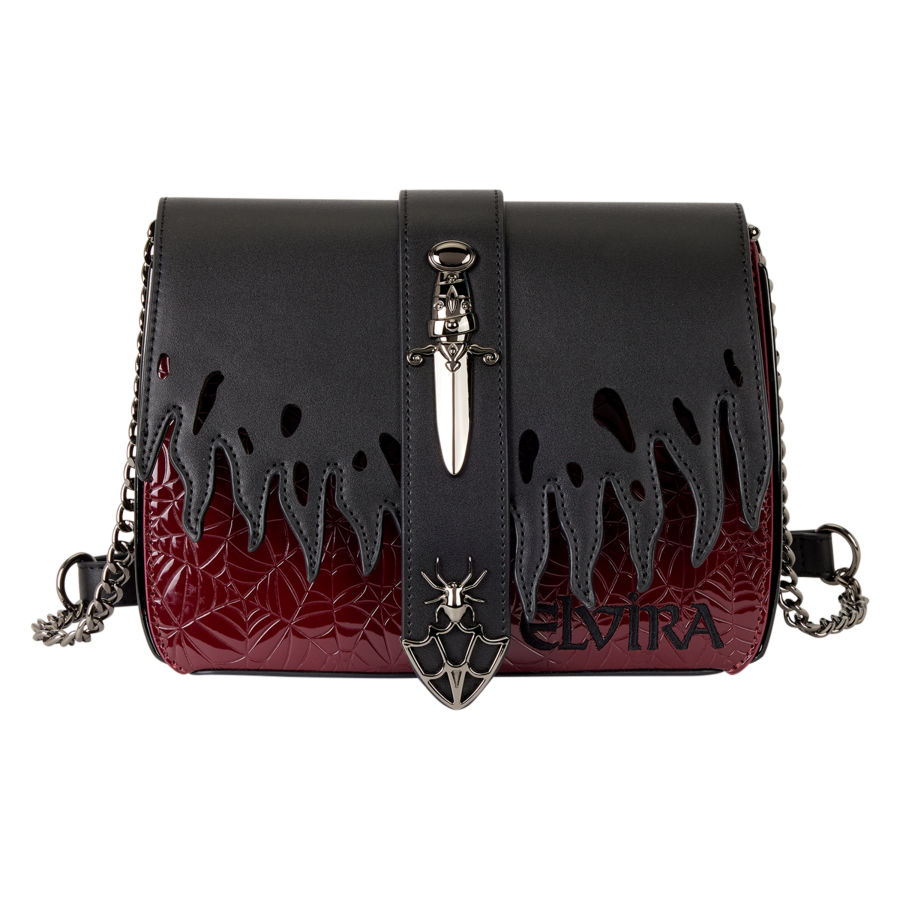 Instantly uplevel your look with this Elvira-inspired crossbody bag! This faux leather crossbody features red flames that have debossed spider webs within it. You'll find embroidery of spiders and Elvira's name on the front and back of the bag. A black strap extends down the front, featuring a molded metal charm of a dagger and a spider! Don't be afraid to get a little spooky and make your look extra unique with this crossbody bag! Features - Faux leather (polyurethane) - Adjustable shoulder strap - Applique, debossed, embroidered, and printed details - Molded metal charms - Coordinating interior lining Dimensions: 9.5"W x 7"H x 4"D 24.1cm W x 17.7cm H x 10cm D This is an officially licensed Elvira product.