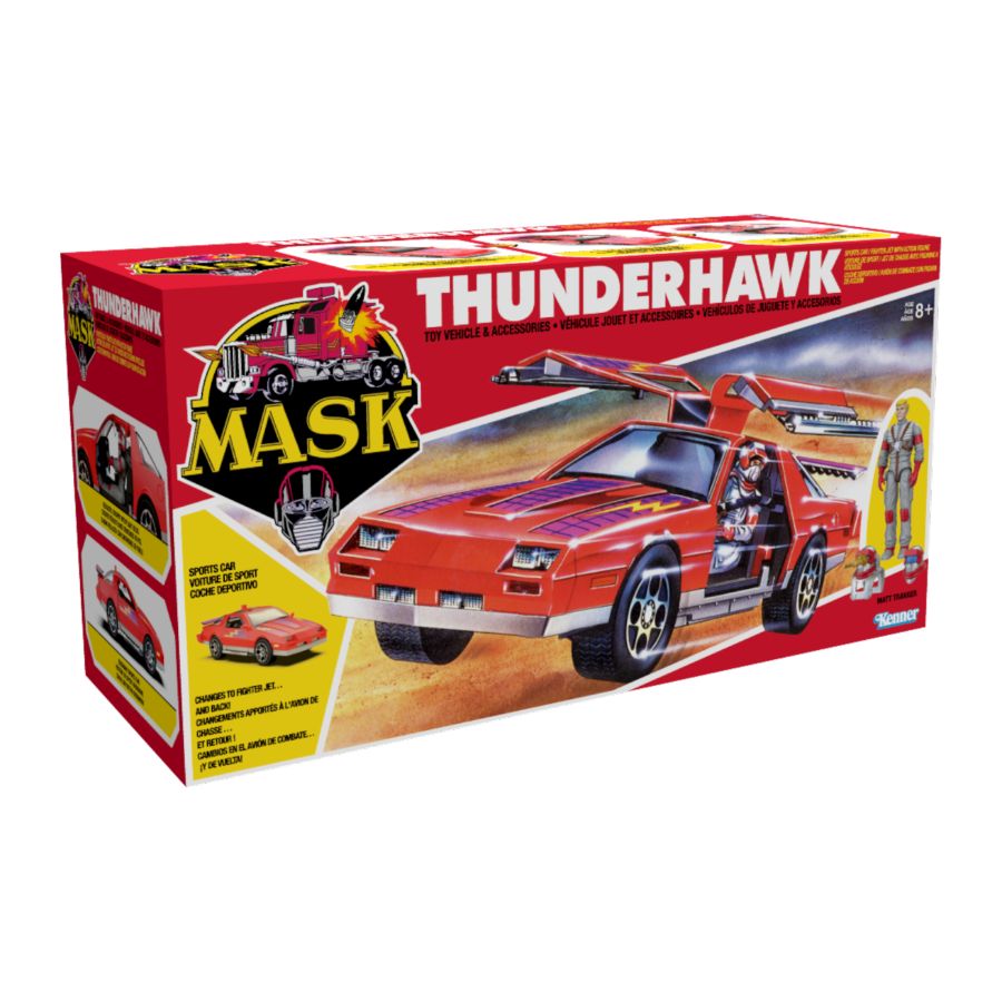 Strike from the skies with Thunderhawk! First released in 1985 and now reborn by The Loyal Subjects, this iconic sports car converts into a powerful jet fighter with just a push. With bold gull-wing doors that flip into wings and hidden weaponry for surprise attacks, Thunderhawk leads the charge!! Featuring Matt Trakker, the fearless leader of M.A.S.K., and his signature SPECTRUM mask, this high-speed collectible blends nostalgia with premium upgrades for the ultimate play-and-display experience. The Loyal Subjects' Thunderhawk is a turbo-charged machine with realistic rubber tires, flame-booster FX, expandable wing-tip stabilizers, and seating for two M.A.S.K. agents. With upgraded sculpting, enhanced details, and a sturdy conversion mechanism, Thunderhawk is primed for aerial domination. Features: Convert to Airstrike Mode - Flip-open wing doors and deployable jet boosters deliver instant skybound action Matt Trakker Figure - Classic series hero with removable SPECTRUM mask for scanning and stun-bomb attacks. Includes second interchangeable mask with longer fit. Flame-Effect Boosters - Clip-on FX accessories simulate fiery lift-off and flight motion Realistic Rubber Tires - Rolling wheels and sculpted treads bring ground pursuit realism Detailed Sculpting & Wing-Lift Mechanism - Strong hinges and upgraded molds preserve vintage style with modern quality Seating for Two Figures - Designed for teamwork and compatibility across the M.A.S.K. line Expandable Wing-Stabilizers - Snap out into place for stable airborne cruising or combat Retro-Inspired Packaging - '80s-style box art, conversion graphics Metallic Details - Bold metallic accents with a classic vac metal finish that shine just like the originals