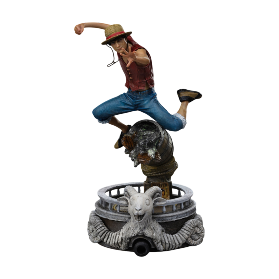 Leaping above the head of a ram carved into the prow of the Going Merry, the iconic ship of which he became captain after forming his crew, the leader of the Straw Hat Pirates knocks over a barrel of fish while stretching his elastic right arm, fist clenched, ready to unleash his "Gomu Gomu no Pistol", a long-distance punch delivered quickly, causing significant damage to his opponent. Carefree and cheerful, with a kind heart and a huge appetite, his determination to achieve his dream of becoming the King of the Piratesand therefore the freest man in the worldis unshakable, and he's willing to risk his life for it. After eating the Gomu-Gomu no Mi fruit and becoming a rubber man, he gained the ability to stretch and deform his body in various ways to attack, naming each of his moves. Immune to electricity and most brute force attacks, he possesses incredible resistance thanks to the properties of his body. Always optimistic and daring, wearing only a red vest, a pair of blue jeans, a belt, brown shoes, and, of course, his inseparable straw hat, Iron Studios brings the statue "Monkey D. Luffy - One Piece Series - Art Scale 1/10", inspired by the TV series from Netflix, featuring an impressively realistic likeness to the facial features of actor Iñaki Godoy, who portrays the character.
