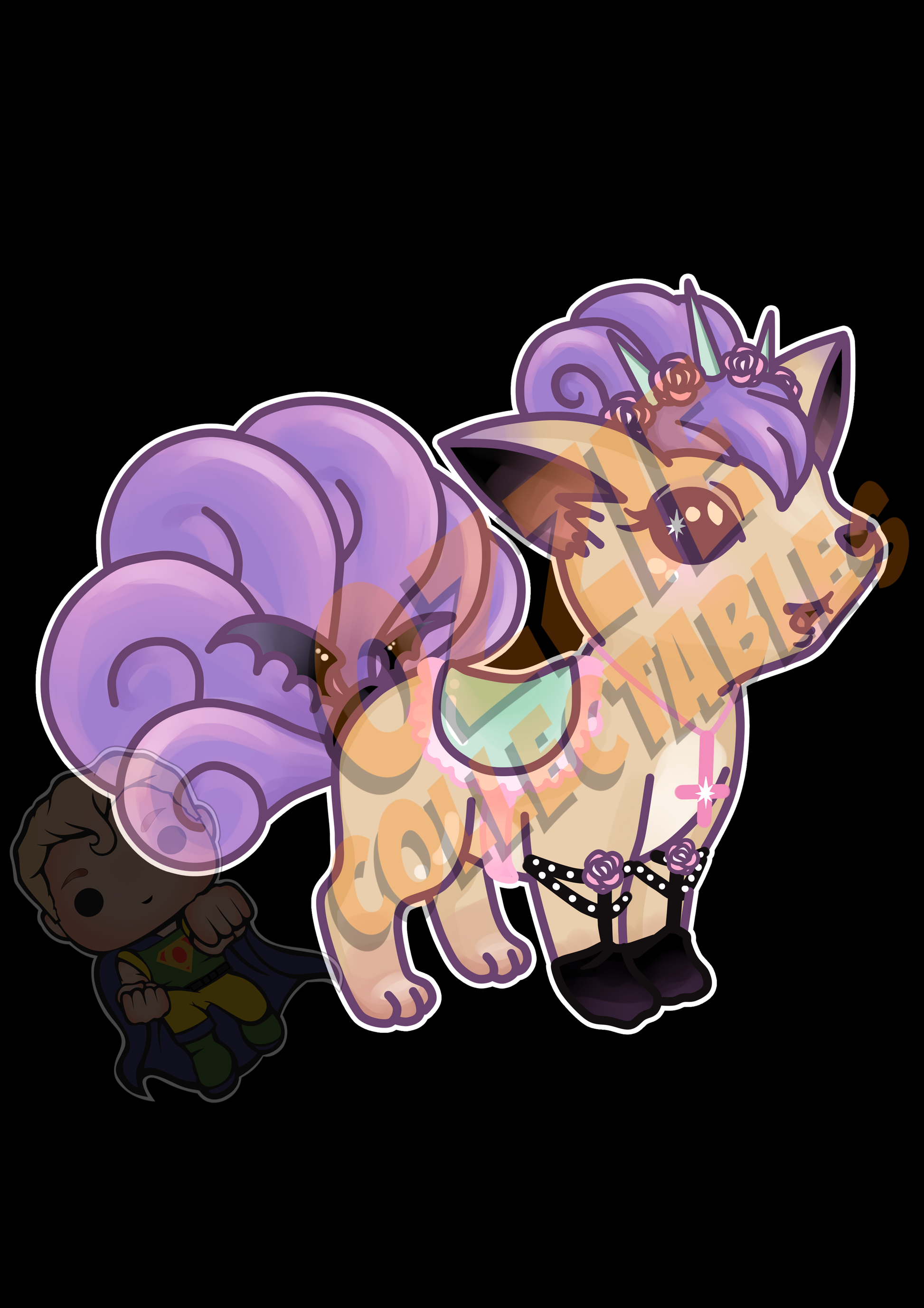 Your fave Pocket Monster just got a gothic makeover! This gorgeous print features fan favourite fire-type Gen I Pokemon Vulpix as a pastel goth icon, complete with a tonne of creepy cute accessories. Hang this print in your home or anywhere that needs a touch of geeky gamer style!