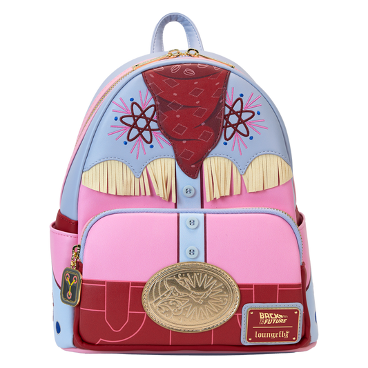 Heading back to the future for a third time? That's heavy. Dress the part with a mini backpack inspired by Marty McFly's Western attire. With fringe details, a metallic belt buckle, and embroidery, this accessory pulls out all the stops for a look that's ahead of its time. Features: - Vegan leather (polyurethane) - Adjustable shoulder straps - Front zipper pocket - Side drop pockets - Enamel zipper charm - Shiny gold hardware - Applique, embossed, embroidered, fringe, metallic, button, and printed details - Coordinating 40th Anniversary lining Dimensions: 9"W x 10.5"H x 4.5"D This backpack is an officially licensed Back To The Future product.