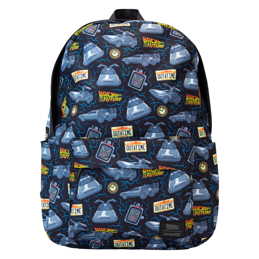 Heading back to the future for a third time? That's heavy. Put the pedal to the metal with a full-size backpack inspired by Doc and Marty's time-traveling automobile. With plenty of room to store your essentials, you'll be ready to face any challenge in any timeline. Features: - Nylon material - Adjustable shoulder straps - Front zipper pocket - Sturdy metal hardware - Printed details - Coordinating 40th Anniversary lining Dimensions: 11.5"W x 17.5"H x 5"D This backpack is an officially licensed Back To The Future product.