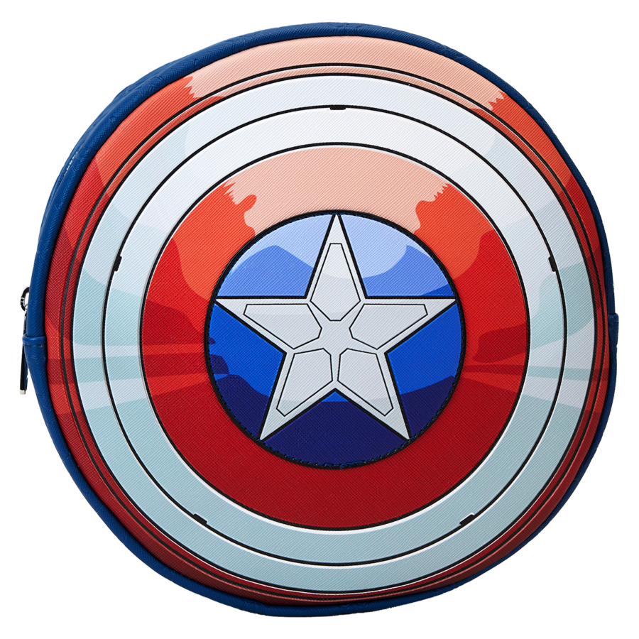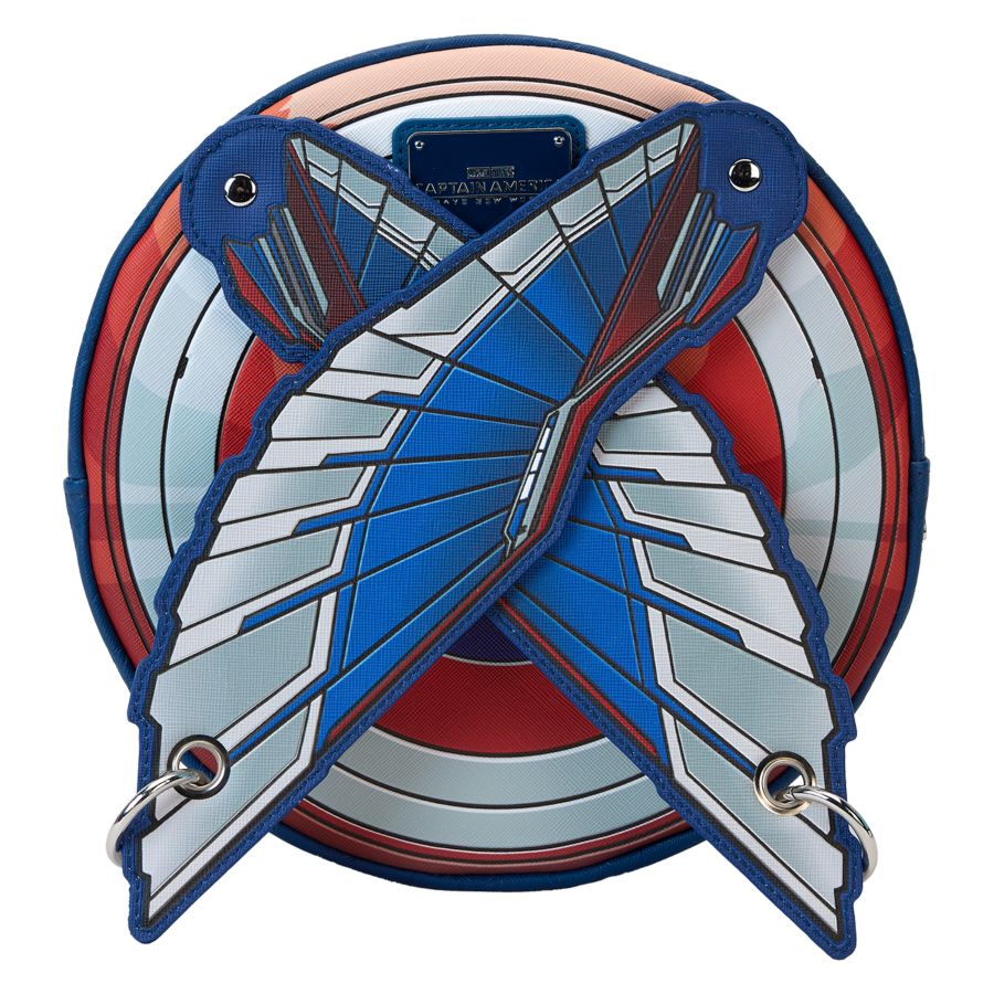 It's time to pick up the shield! Start a new chapter in your Marvel collection with a crossbody bag inspired by Sam Wilson's Captain America uniform. With retractable wings on the back of the bag, this accessory will have you flying into your next mission in style. Features: - Vegan leather (polyurethane) - Adjustable (detachable) shoulder strap - Zippered closure - Shiny silver hardware - Applique, debossed, foil, moving rivet, and printed details - Coordinating inside lining Dimensions: 9" W x 9" H x 3" D This bag is an officially licensed Marvel product.
