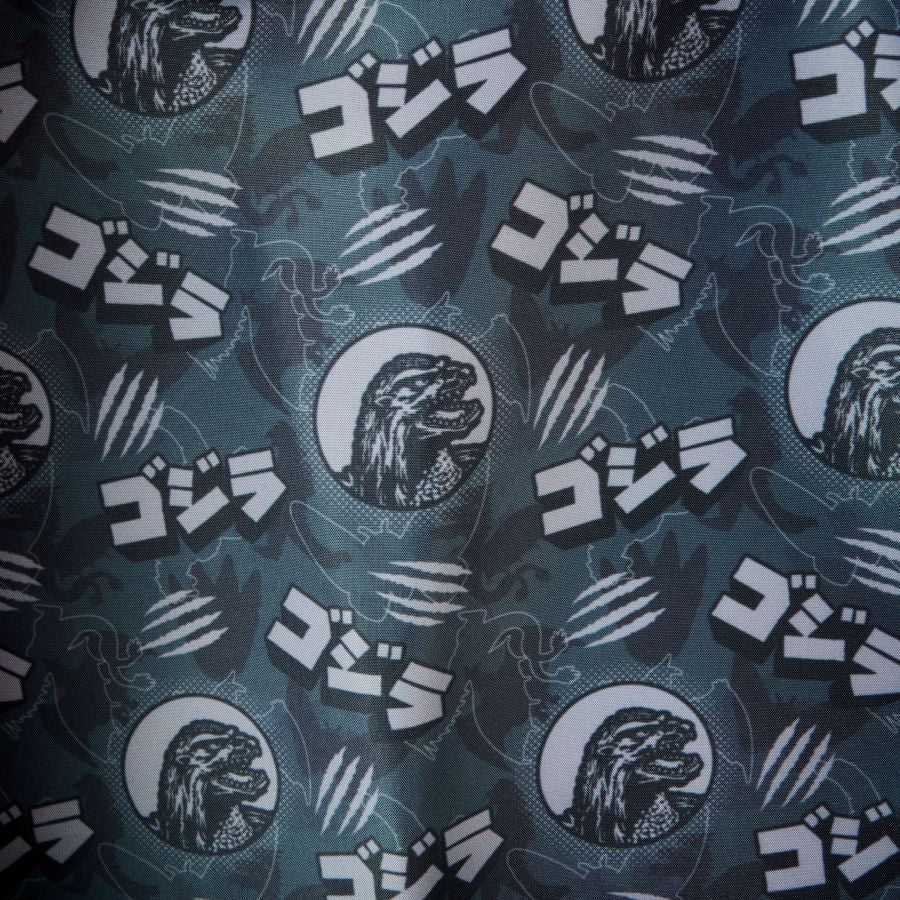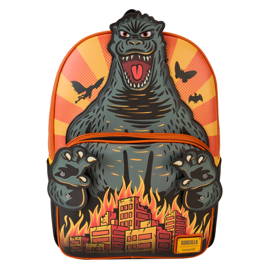 Head to your stomping grounds in style. Shake things up with our Godzilla full-sized backpack. An "attack" takes place in fiercely fun detail on the front of this backpack. An applique of Godzilla's head rises up over the front pocket, which displays a print of a city under siege and fire. Godzilla's claws reach forward, and his arms move on rivets! "Explosions" of orange and yellow colors appear behind him, along with the shadows of other winged monsters nearby. Flip the backpack around, and youll discover a mesh material with Godzilla's name and footprint embroidered in the center. Pack your daily essentials and take off on adventures looking fiercely fashionable. Features: - Vegan leather (polyurethane) - Padded, adjustable shoulder straps - Zippered main compartment - Front zipper pocket - Sturdy top handle - Side panels with Godzilla's name in Japanese characters - Gunmetal-colored hardware - Applique, debossed, mesh, embroidered, moving rivet, and printed details - Coordinating inside lining Dimensions: 12"W x 18"H x 5"D This backpack is an officially licensed Toho product.
