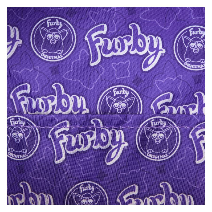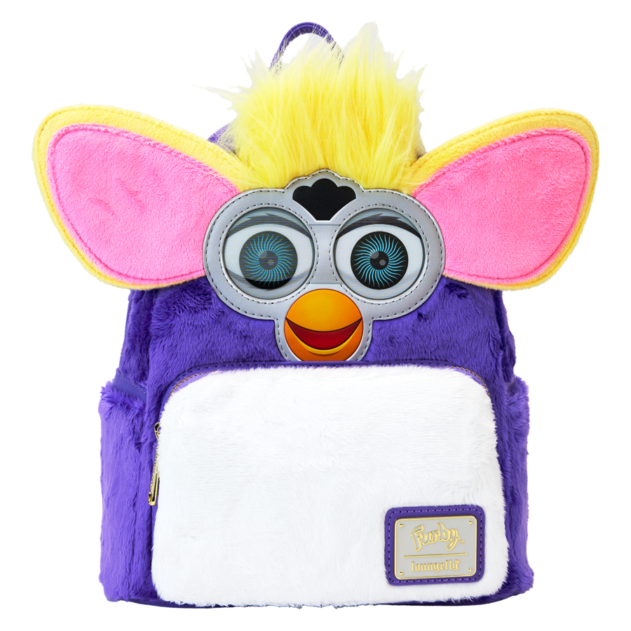 Cute and a little creepy, just the way we like it! This mini backpack pays homage to our beloved bestie from childhood, complete with eyes that shift open and closed just like the real deal. Bring this accessory on your next adventure and you'll be speaking Furbish in no time! Features: - Faux fur with vegan leather (polyurethane) trim - Adjustable shoulder straps - Front zipper pocket - Side drop pockets - Shiny gold hardware - Applique, debossed, lenticular, fleece, foil, and printed details - Coordinating inside lining Dimensions: 9"W x 10.5"H x 4.5"D This backpack is an officially licensed Furby product.