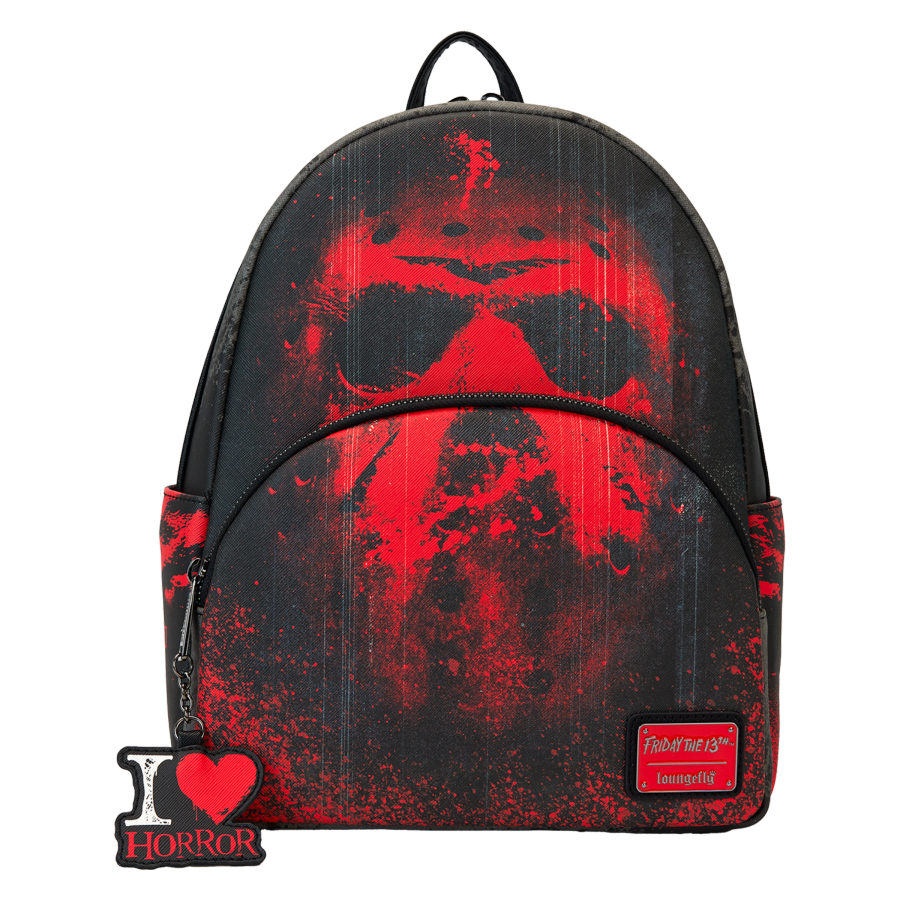Camp Crystal Lake is calling, and you can head there in style. This Friday the 13th mini backpack is perfect for horror lovers who want to show off their fandom year-round. An eerie, blood-spattered print of Jason's mask rises up over the front and continues on the zipper pocket below. A vegan leather charm that says, "I (heart) Horror" tops off the look. Pack just what you need for the day to chase after wicked fun adventures. Features: - Vegan leather (polyurethane) - Adjustable and padded shoulder straps - Sturdy top handle - Original artwork on all sides - Front zipper pocket - Gunmetal-colored hardware - Vegan leather charm and printed details - Coordinating inside lining Dimensions: 10.15"W x 12.5"H x 4"D This backpack is an officially licensed Warner Bros. product.