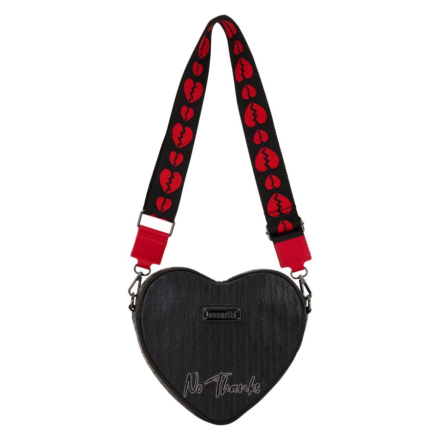 Make a statement with some anti-Valentine's Day style! This figural crossbody is in the shape of a heart. The body features a black faux basket weave and embroidered on the back, it says "No Thanks." The front pocket is also in the shape of a heart – but this one is broken. You'll find velvet details on it. Make your style your own for the upcoming Valentine's season! Features - Polyurethane - Adjustable crossbody strap - Embroidered, faux basket weave, velvet, and printed details - Coordinating interior lining Dimensions: - 9"W x 8.3"H x 3"D - 22.8cm W x 21cm H x 7.6cm D