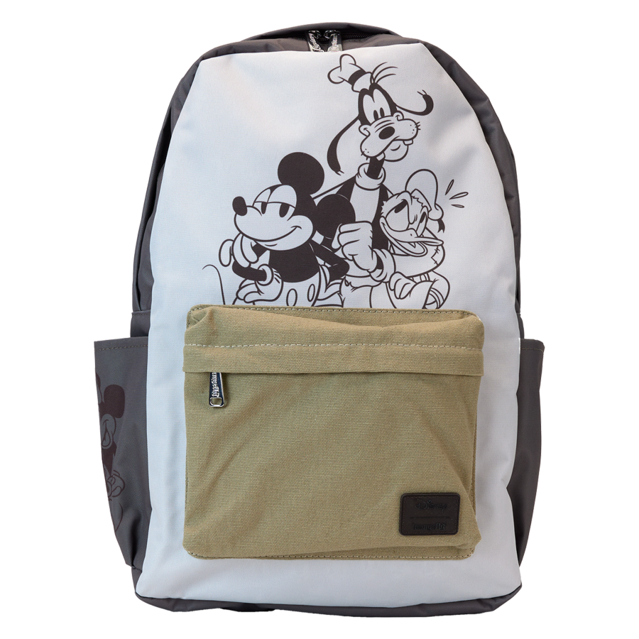 Take those best pal vibes with you wherever you go. This full-size backpack of Disney's Mickey Mouse and Friends sure is swell! The front features a canvas zipper pocket, and Disney's Mickey Mouse, Goofy, and Donald Duck appear as a classic print just above. The side pockets feature Disney's Minnie Mouse and Daisy Duck, and on the back, you'll find a charming print of Disney's Pluto. There's plenty of room to store just what you need to set off on fun adventures in style. Features: - Nylon - Adjustable and padded shoulder straps - Silver-colored metal hardware - Canvas and printed details - Coordinating inside lining Dimensions: 11.5"W x 17.5"H x 5"D This backpack is an officially licensed Disney product.
