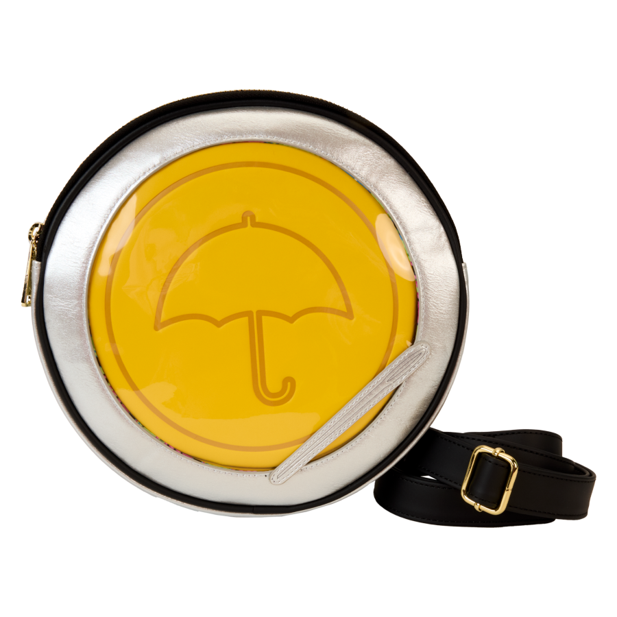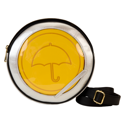 A winning look takes shape on this Squid Game crossbody bag. Capture iconic moments from the Netflix series with this accessory, which showcases the Dalgana Candy challenge. This fully figural bag, in the circular shape of a candy tin, holds a reversible and detachable yellow coin bag. The coin bag displays the umbrella shape on one side, and a triangle on the other. Silver metallic faux leather adds extra sparkle, along with clear PVC material on the front. A die-cut applique of the cutting utensil for this game adds a realistic detail. Pack your daily essentials and take on any challenge in style. Features: - Vegan leather (polyurethane) - Adjustable and detachable shoulder straps - Detachable and reversible coin bag - Gold-colored metal hardware - Applique, debossed, metallic faux leather, PVC, and printed details - Coordinating inside lining Dimensions: 9"W x 9"H x 3.5"D This crossbody bag is an officially licensed Netflix product.