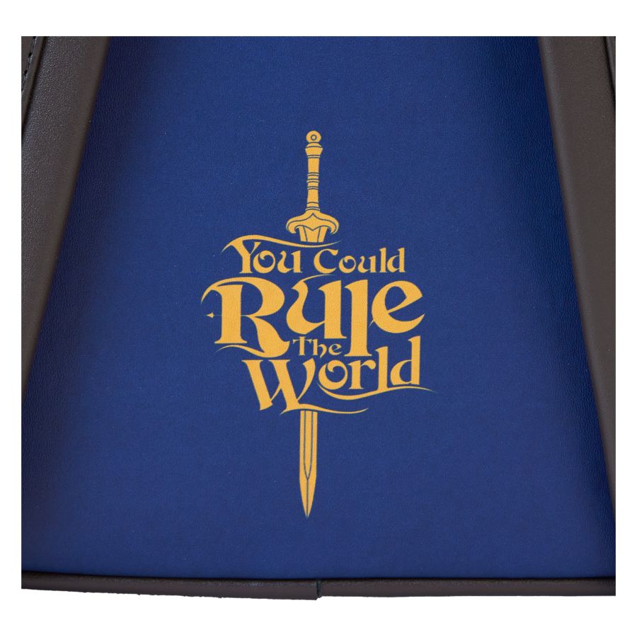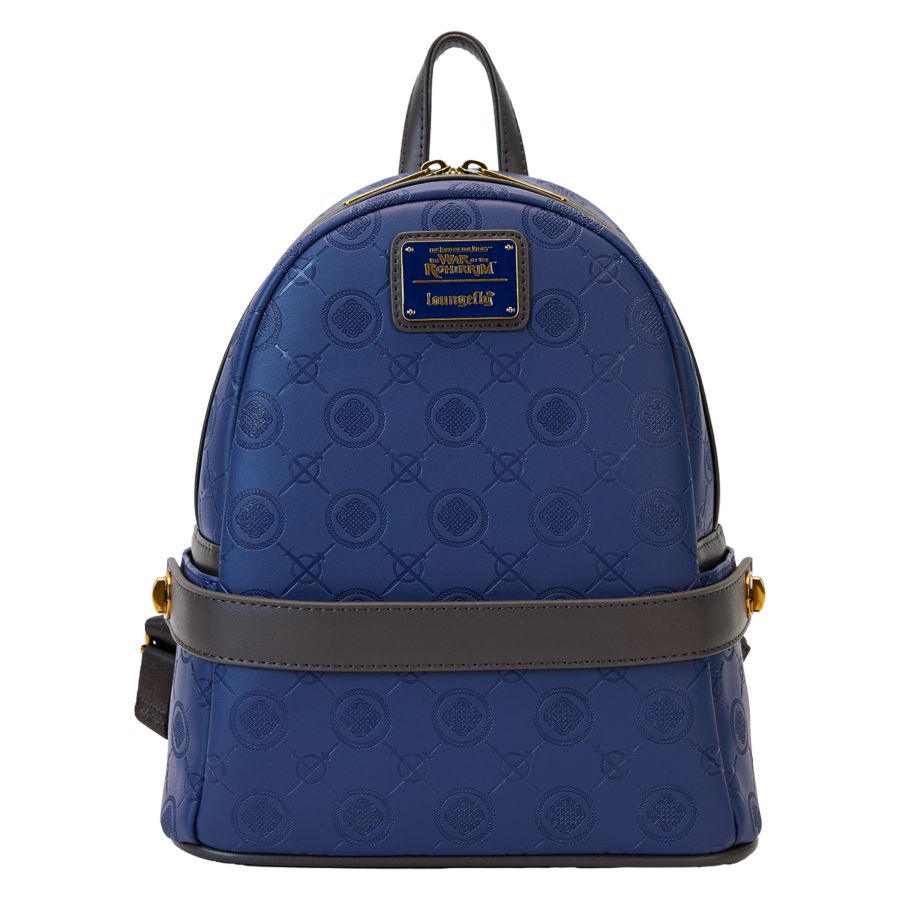 Arise and ride off to defend Rohan in style! This The Lord of the Rings: The War of the Rohirrim mini backpack is ready for adventures. The front circular pocket features a vivid print of fan-favorite characters, including Hèra, Wulf, and Helm Hammerhand. This versatile pocket, which is detachable, comes with an adjustable strap for wearing around the waist. An all-over debossed pattern of crossed swords and emblems, which blends in with the royal blue background, adds an elegant nod to the fandom. Flip the backpack around, and you'll find the words, "You could rule the world." Pack just what you need for the day to journey to Middle-Earth in the latest fashion. Features: - Vegan leather (polyurethane) - Adjustable and padded shoulder straps - Sturdy top handle - Detachable waist bag front pocket with adjustable/detachable straps - Gold-colored hardware - Debossed, gold foil, and printed details - Coordinating inside lining Dimensions: 9"W x 10.5"H x 4.5"D This backpack is an officially licensed Warner Bros. product.