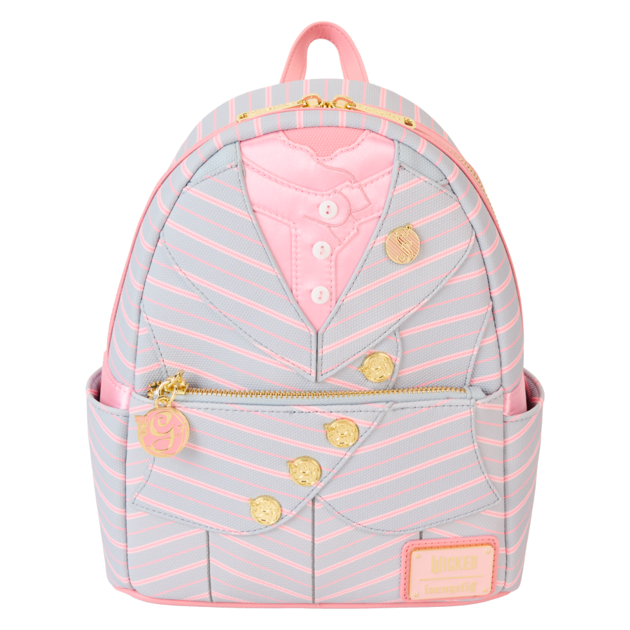 Crafted for fans of the hit musical Wicked, this Loungefly mini backpack features intricate polyester and faux leather design, adorned with real buttons, gold foil, and a charming enamel zipper pull. Perfect for cosplay or everyday wear, this backpack also boasts detailed molded metal buttons. W: 9" x D: 10.5" x D 4.5" Officially Licensed Universal Product