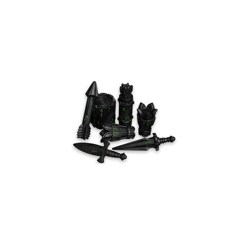 Each PolyHero Ranger 8 Dice Set comes with: 2d20 Logs, 1d12 Quiver, 1d8 Arrow, 1d6 Short Sword, 2d10 Bracers, 1d4 Dagger