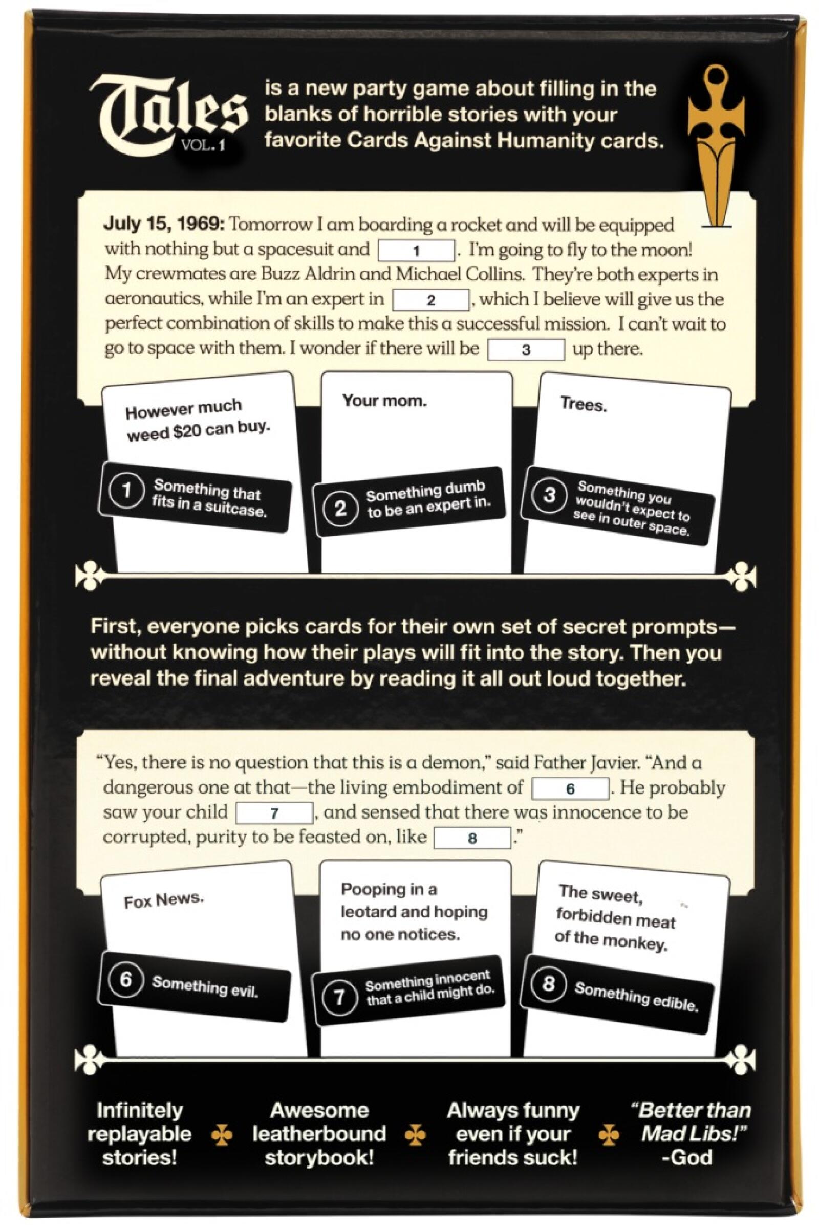 Tales is a storytelling-based party game that incorporates cards from Cards Against Humanity.