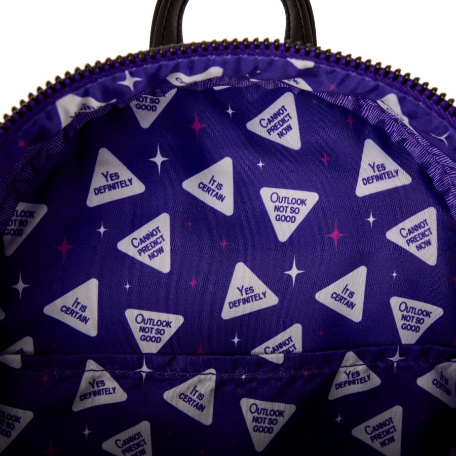 What does your future hold?! Okay, raise your hand if you had a Magic 8 Ball! Now you can relive your fortune-telling years wtih this mini backpack! The front pocket is a 3D Magic 8 Ball with a lenticular feature that cycles between different fortune messages. The rest of the bag features an all-over print of the different fortunes the Magic 8 Ball has in store for you! Nostalgia is always in - past, present, and future! Features Faux leather (polyurethane) Sturdy top handle Adjustable shoulder straps Lenticular feature Silicone zipper charm Applique, debossed, and printed details Coordinating interior lining Dimensions: 9"W x 10.5"H x 4.5"D 22.8cm W x 26.6cm H x 11.4cm D This is an officially licensed Mattel product.