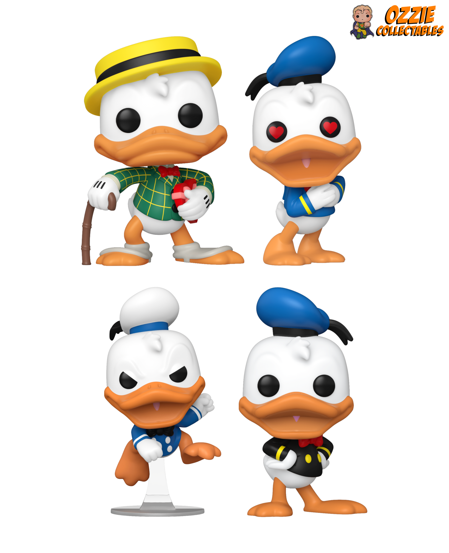 Celebrate the quack-tastic legacy of Donald Duck with the exclusive 90th Anniversary Bundle, available now at Ozzie Collectables! This discounted collection features four iconic Donald Duck POP! Vinyl figures, each capturing a different facet of the beloved character's personality. Get ready for a trip down memory lane with the suave Donald Duck (Dapper) Pop! Vinyl, or embrace the loveable side with Donald Duck (Heart Eyes) Pop! Vinyl. For those moments of feathery fury, there's the Donald Duck (Angry) Pop! Vinyl, and lastly, relive the nostalgia with the vintage-inspired Donald Duck (1938) Pop! Vinyl. Each figure comes with a free Pop Protector to ensure these collectables stay in pristine condition. Don't miss this quacking good deal – a must-have for any Disney enthusiast!