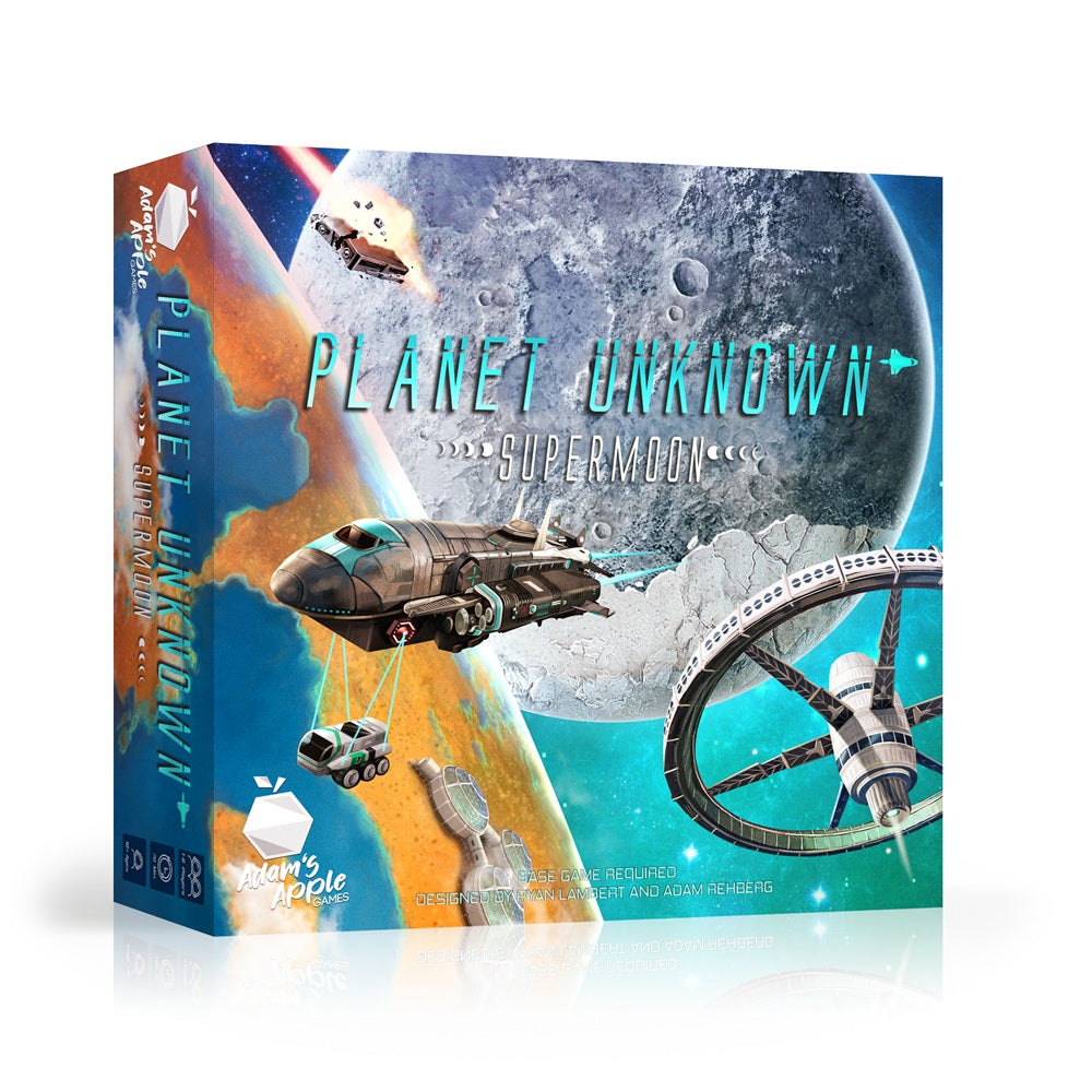 The meteor strikes have caused great damage. We’ve gathered as much wreckage as possible so please use the salvage carefully. Complete the primary objective and build the planet that will preserve humanity. Expand your developments onto the Supermoon in case the meteorite hazards get out of hand. Planet Unknown is a polyomino tile-laying game that mixes tile-placement, engine-building, simultaneous play, and resource and rover management for a unique and competitive gameplay experience. Supermoon is the first expansion.