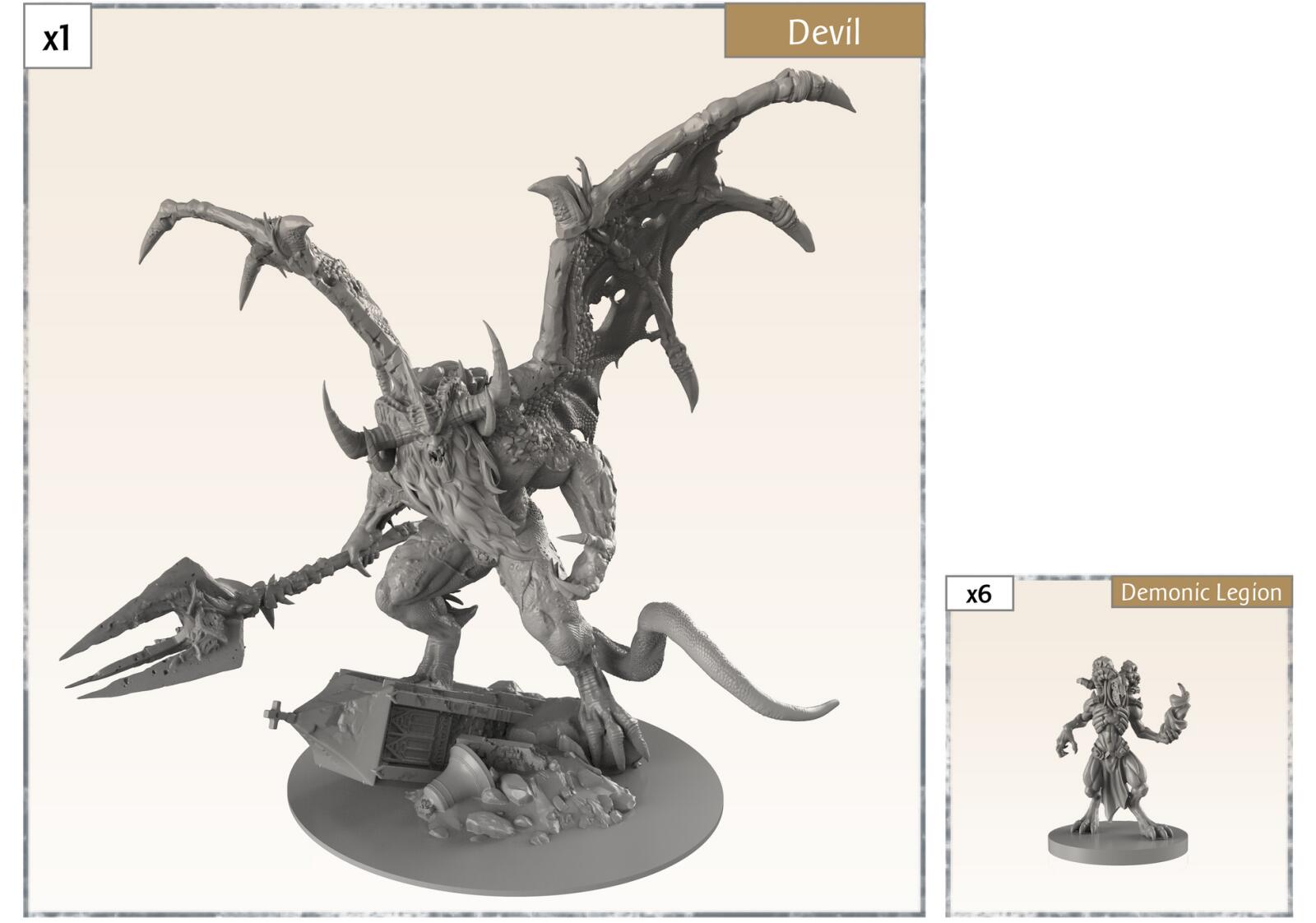 An 8 inches tall Devil miniature that comes with extra gigantic dice, extra terrain pieces, tiles, two scenarios (one of them being solo/coop) and a few more smaller demons.