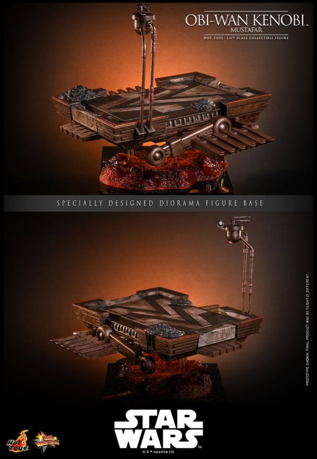 On the volcanic plains of Mustafar, Obi-Wan Kenobi faces perhaps his darkest trial - confronting Anakin Skywalker in a duel that will forever change their fates. Amid the blast furnaces and molten rivers, every wound, every word, and every step is steeped in tragedy and resolve. Hot Toys is honored to present the 1/6th scale Obi-Wan Kenobi (Mustafar) Collectible Figure, capturing Ewan McGregor’s performance in Revenge of the Sith with meticulous detail. The head sculpt features separate rolling eyeballs and a finely sculpted dark brown short hairstyle, complemented by a strand of wool material hair implanted on the fringe to enhance realism. His face carries the weight of that fateful duel, complete with lifelike skin texture and beard detailing. The figure is dressed in a finely tailored costume applied with weathering effects to capture the intensity of the fierce duel on Mustafar. His ensemble includes a tabard, outer tunic, and under tunic, all tied together at the waist with an obi and a detailed utility belt, completed by pants and long boots. Included are nine interchangeable hands and blue lightsaber blades with both LED-lighted and non-lighted hilt options for dynamic action. The 1/6th scale Obi-Wan Kenobi (Mustafar) Collectible Figure specially features: - Authentic and detailed likeness of Ewan McGregor as Obi-Wan Kenobi in Star Wars: Revenge of the Sith - Head sculpt with separate rolling eyeballs - Movie-accurate facial expression with detailed wrinkles, beard, and skin texture - Meticulously sculpted dark brown short hairstyle with a strip of wool material hair implanted on the fringe - Body with 30 points of articulation - Approximately 30.5 cm tall - Nine (9) pieces of interchangeable hands, including: - One (1) pair of relaxed hands - One (1) pair of lightsabers holding hands - One (1) pair of slightly opened lightsabers holding hands - One (1) pair of Force-using hands - One (1) piece of two-finger pointing gesture left hand Costume: - One (1) set of finely crafted Obi-Wan Kenobi costume with weathering effects, including: - One (1) beige colored tabard - One (1) beige colored outer tunic - One (1) red-brown colored under tunic - One (1) beige colored obi - One (1) dark brown colored utility belt with a silver colored buckle, attached with a black colored lightsaber hilt holder and pouches - One (1) pair of brown colored pants - One (1) pair of red-brown colored leather-like textured long boots Weapons: - One (1) LED-lighted lightsaber hilt (blue light, USB powered) - One (1) lightsaber hilt - One (1) blue lightsaber blade (attachable to the LED-lighted lightsaber hilt and lightsaber hilt) - One (1) blue lightsaber blade in motion (attachable to the LED-lighted lightsaber hilt and lightsaber hilt) Accessories: - Specially designed diorama figure base with repulsor platform (articulated side flaps) and translucent lava effects (approximately 38cm (L) x 31cm (W) x 28.5cm (H)) - Two (2) waist clip stands (attachable to the diorama figure base) *USB connecting cable is not included for collectible figure, USB-C cable is required for lightsaber hilt light-up function