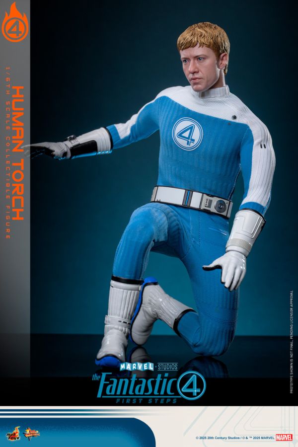 "What time is it, Ben?" - Human Torch Welcome to the family. Marvel Studios introduces its First Family in a 1960s-inspired style with The Fantastic Four: First Steps. Set in an alternate Earth reminiscent of the Space Race era, the Fantastic Four unite to defend their world from cosmic threats like Galactus and Silver Surfer, while discovering the true power of family. Johnny Storm, aka Human Torch, is the fiery soul of the team. With a blend of bravado, humor, and charm, Joseph Quinn's take on the Human Torch shows a young man discovering both his powers and his place among the family. Sideshow and Hot Toys are proud to present the Human Torch Sixth Scale Collectible Figure. The Marvel action figure features a newly developed head sculpt with separate rolling eyeballs and meticulously sculpted blonde hair. He wears the blue-and-white Fantastic Four uniform with a coordinating belt and long boots. The figure offers eight interchangeable gloved hands and two flame effect hands to recreate him using his pyrogenesis ability. Accessories come with a stunning 32cm tall orange and red gradient translucent flying flame effect, interchangeable with the figure's lower body to recreate moments when Johnny uses his flame powers to fly. Presented on a specially designed figure base, he's ready to flame on! Complete the Fantastic Four: First Steps lineup by adding Human Torch to your collection, because every team needs a fiery and bold member. The Human Torch Sixth Scale Figure features: - Authentic and detailed likeness of Joseph Quinn as Human Torch in The Fantastic Four: First Steps - Newly developed head sculpt with separate rolling eyeballs - Meticulously crafted blonde hair sculpt - Body with 30 points of articulation - Approximately 30cm tall - Eight (8) pieces of interchangeable gloved hands, including: - One (1) pair of fists - One (1) pair of relaxed hands - One (1) pair of opened gesture hands - One (1) pair of knifehand strike gesture hands - Two (2) pieces of interchangeable flame effect hands, including: - One (1) opened gesture left hand - One (1) right fist Costume: - One (1) newly tailored blue and white colored ribbed elastic fabric material Fantastic Four uniform - One (1) white and cream colored belt - One (1) white colored long boots Accessories: - One (1) double-layered orange and red gradient colored translucent flying flame effect (approximately 32cm tall and interchangeable with the lower body of the figure) - Specially designed figure stand with The Fantastic Four: First Steps logo, character silhouette, and character nameplate