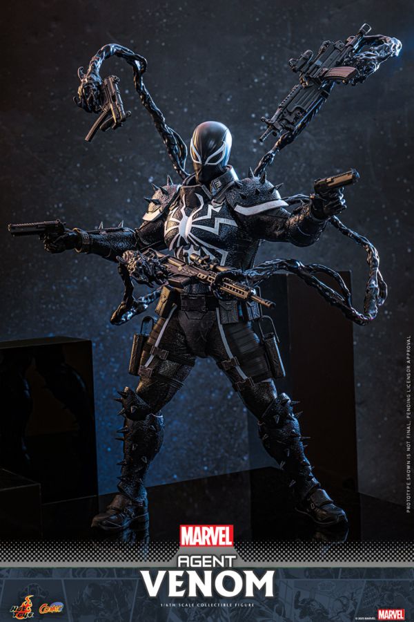Flash Thompson grows up to join the army but loses his legs in combat. Bonding with the Venom symbiote allows him to walk again while in the suit, and he also becomes Agent Venom for the government. Possessing powers similar to Spider-Mans, he gains superhuman abilities and the ability to generate webbing. Sideshow and Hot Toys are excited to present this new Agent Venom Sixth Scale Collectible Figure, which is sure to give your display a remarkable upgrade. Meticulously crafted based on Marvel Comics, the Agent Venom action figure features a newly crafted head sculpt with interchangeable eye pieces, a specialized body that naturally portrays Agent Venoms muscular physique, a symbiotic armor with spikes showcasing a military theme, an interchangeable symbiotic blade forearm, two styles of tendrils attachable to figures back, two strings of webbing accessories, a series of firearms including sniper rifle, machine gun, submachine guns, pistols, and lastly a specially designed figure base with the characters name. Cue the epic comic battles with the Agent Venom Sixth Scale Figure that will take your Marvel Comics collection to the next level. The Agent Venom Sixth Scale Figure features: - Authentic and detailed likeness of Agent Venom in Marvel Comics - One (1) newly developed head sculpt with two (2) pairs of interchangeable eye pieces that can create combinations of expressions - Approximately 32cm tall - Newly developed body with over 30 points of articulations which naturally portrays Agent Venoms muscular physique in comics - Six (6) pieces of interchangeable hands including: - One (1) pair of fists - One (1) pair of gun holding hands - One (1) pair of opened hands Costume: - One (1) symbiotic armor with spikes and white pattern embossed - One (1) black under-suit with white pattern embossed - One (1) utility belt - One (1) pair of thigh gun holsters - One (1) pair of black shoes Weapons: - One (1) interchangeable symbiotic blade forearm - One (1) sniper rifle - One (1) rifle - Two (2) submachine guns - Two (2) pistols Accessories: - Four (4) tendrils (embedded with wire, attachable to the back) - Four (4) gun holding tendrils (embedded with wire, attachable to the back) - Two (2) strings of webbing accessories in different lengths (embedded with wire) - Specially designed figure stand with character nameplate