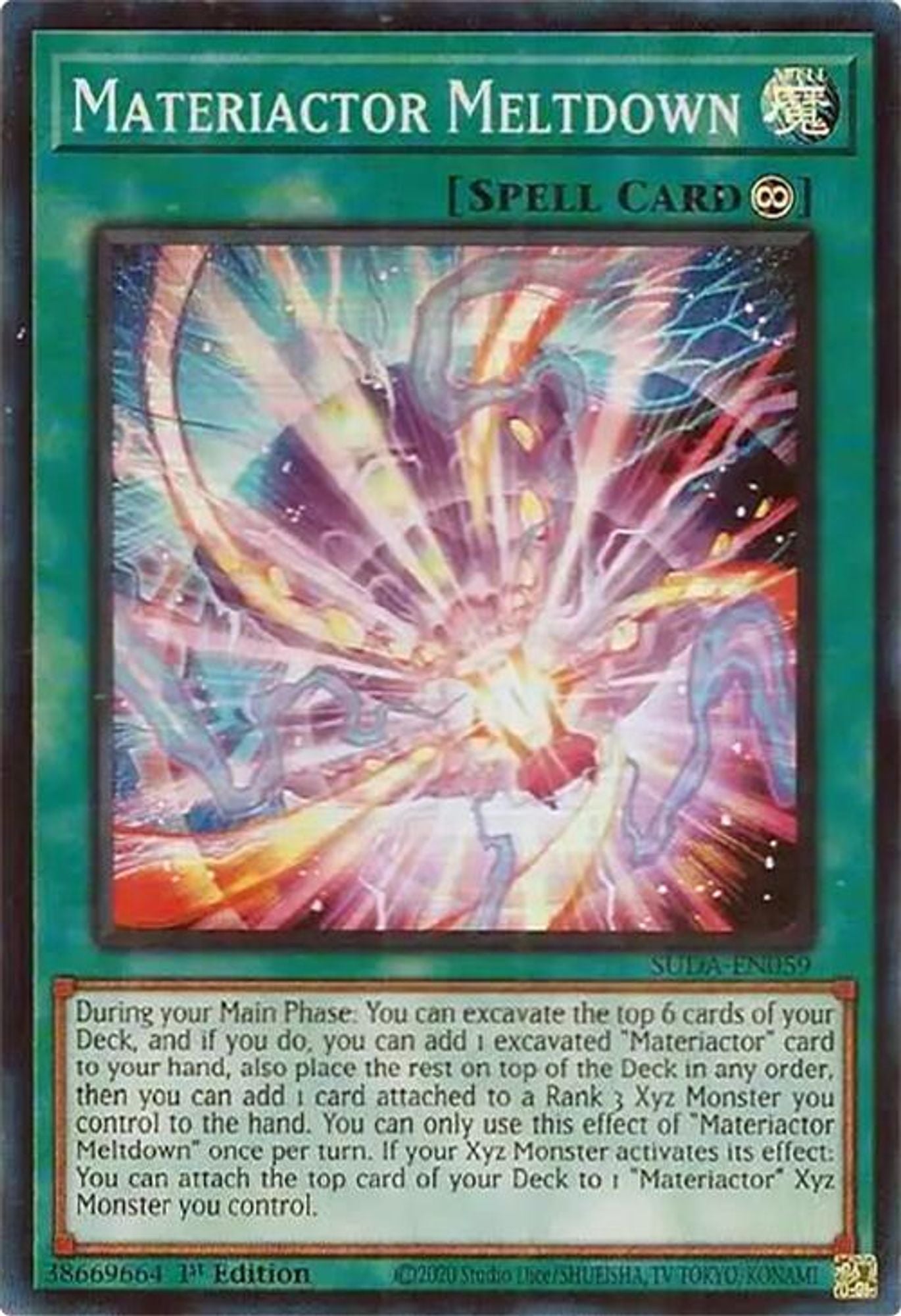- Description: During your Main Phase: You can excavate the top 6 cards of your Deck, and if you do, you can add 1 excavated "Materiactor" card to your hand, also place the rest on top of the Deck in any order, then you can add 1 card attached to a Rank 3 Xyz Monster you control to the hand. You can only use this effect of "Materiactor Meltdown" once per turn. If your Xyz Monster activates its effect: You can attach the top card of your Deck to 1 "Materiactor" Xyz Monster you control.