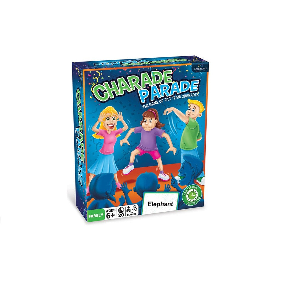 Charade Parade is a collaborative party game where you play tag team charades against the clock. The goal is to get all players to join the charade tag team before you run out of time. Start with a set of challenge cards and one player starts charading the word on the first card.