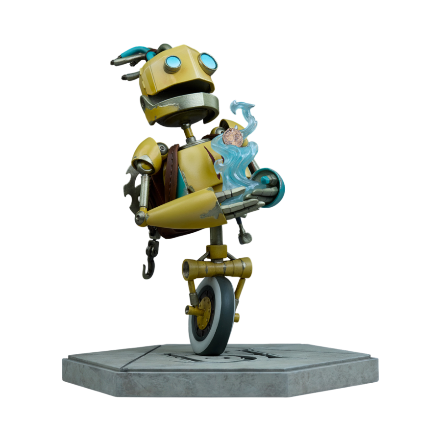 "I'm really drawn to it. It's little and it's metal, but it seems to have a purpose." Sideshow presents the Fresh Cut Grass - Bells Hells Statue, a smiley addition to the official Critical Role collection. This fully sculpted, three-dimensional collectible measures 8.1" tall x 6.6" wide x 7.7" deep and celebrates the cheerful budding therapist on their path to adventure. Smiley day to ya! Fresh Cut Grass, also known as FCG, brings an empathetic attitude and an optimistic resolve to the emergent band of heroes known as Bells Hells. This curious construct helps his friends with thoughtful care while seeking moral guidance from the Coin of the Changebringer. The Fresh Cut Grass - Bells Hells Statue captures their campaign-debut appearance, sporting a worn Aeormaton body that shows slight distress from past adventures. FCG balances on a central wheel, ready to roll alongside their allies into all manner of action and lend a helping hand - or a buzz saw, as the battle requires. The Fresh Cut Grass - Bells Hells Statue stands on a hexagonal faux-stone base engraved with the Bells Hells monogram, complementing other characters coming soon to the collection. His whimsical robotic design is finished with sculpted wires tied together at the top of his head, yellow and blue plating accented with four red chest stripes, and a traveler's pack stocked with tools like a hammer, hook, rope, and his saw arm attachment.