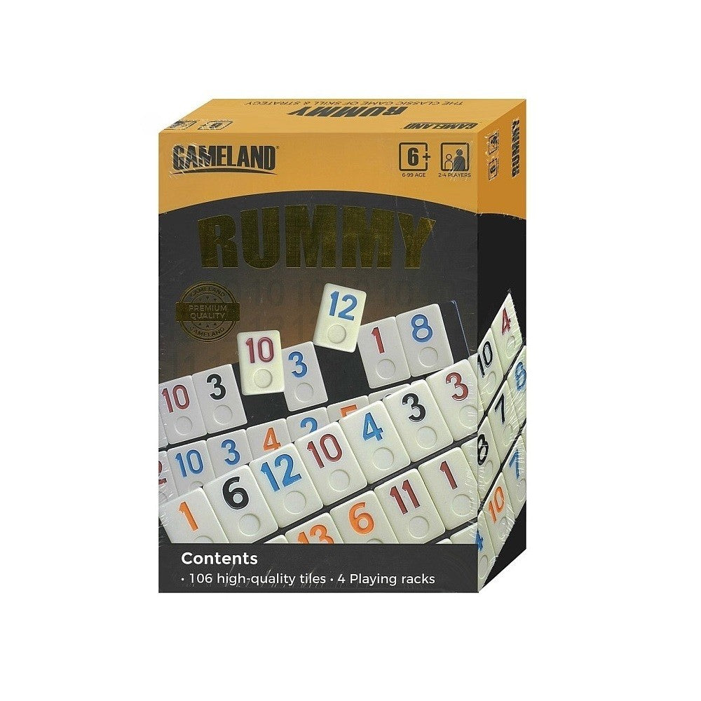 A game of Rummy, with 106 high-quality plastic tiles, and 4 playing racks. Rummy is a fast-moving numbers game, players must try to place runs or groups (eg sequences of consecutive numbers or strings of the same number) of their tiles down in the play area. The winner is the first player to use all their tiles and by accumulating the highest score.