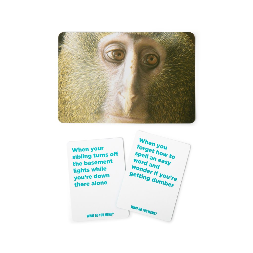 What Do You Meme?® lets you compete with your friends and family to create the funniest memes. Each player draws seven caption cards. A designated photo card is chosen for the round, and placed on the easel, and everyone except the judge chooses a caption card to pair with the photo card, passing it to the judge face down.