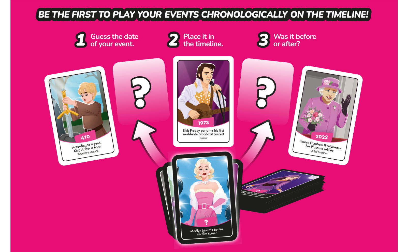 The team's goal is to get rid of all the cards the players have in hand, either by placing as many events as possible in the right order on the timelines, or by discarding them wisely.