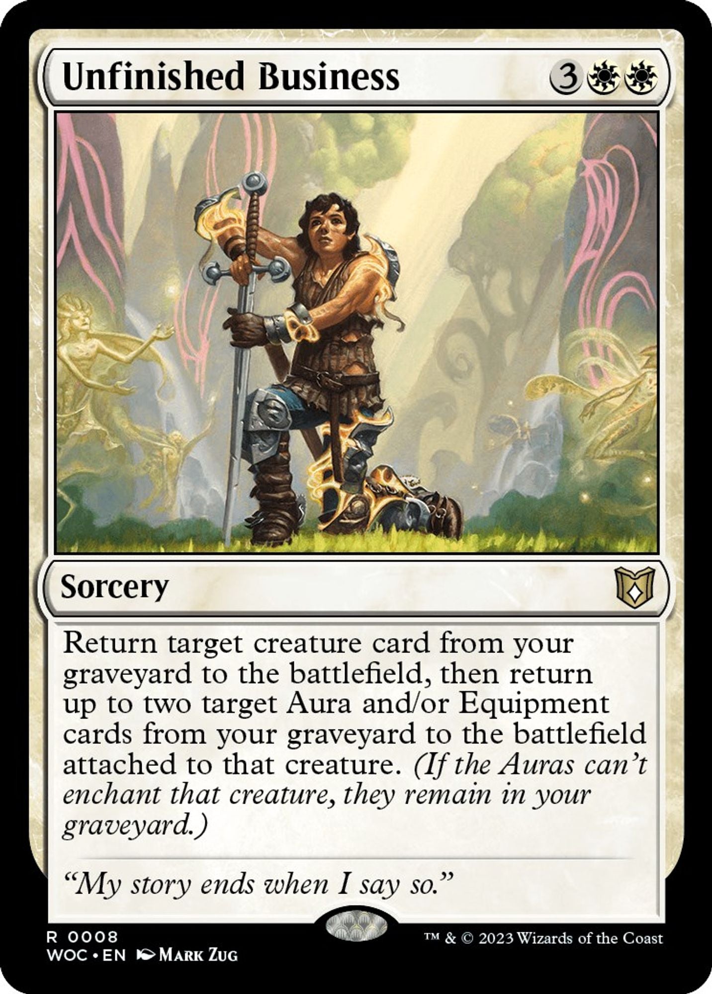 - Description: Return target creature card from your graveyard to the battlefield, then return up to two target Aura and/or Equipment cards from your graveyard to the battlefield attached to that creature. (If the Auras can't enchant that creature, they remain in your graveyard.)