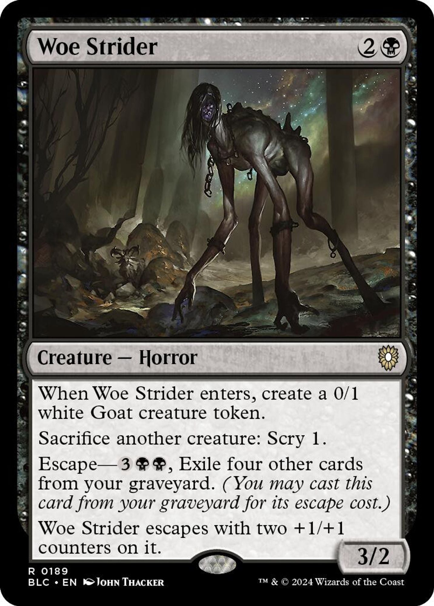 Woe Strider escapes with two +1/+1 counters on it. - Artist: John Thacker