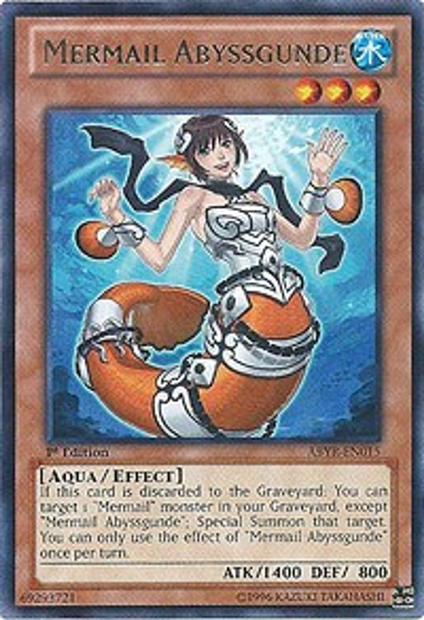 - Description: If this card is discarded to the Graveyard: You can target 1 "Mermail" monster in your Graveyard, except "Mermail Abyssgunde"; Special Summon that target. You can only use the effect of "Mermail Abyssgunde" once per turn.