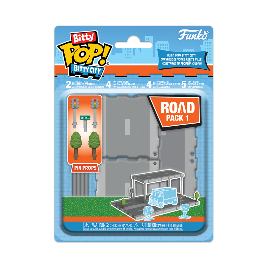 The world of POP! is getting bigger "and smaller" with Bitty POP! collectibles! Expand your Bitty City collection with Bitty POP! Road Pack 1! This expansion pack includes 2 2x1 Road Tiles, 4 1x1 Road Tiles, 4 2x1 Pin Risers, and 5 Pin Props. Tiles can be interlocked, elevated with Pin Risers, and accessorized with Pin Props. Mix and match Bitty POP! Road Pack 1 with other expansion packs and your favourite Bitty POP! collectibles to construct your own unique Bitty City! Vinyl 2x1 Tiles are approximately 5.2 in x 2.6 in (13.2 cm x 6.6 cm). Vinyl 1x1 Tiles are approximately 2.6 in x 2.6 in (6.6 cm x 6.6 cm). Vinyl Pin Risers are approximately 2.5 in (6.4 cm) tall. Vinyl Pin Props are approximately 0.5 in to 1.7 in (1.3 cm to 4.3 cm) tall. Warning: Choking Hazard. Collectibles are small. Not for children under the age of 3 years old.