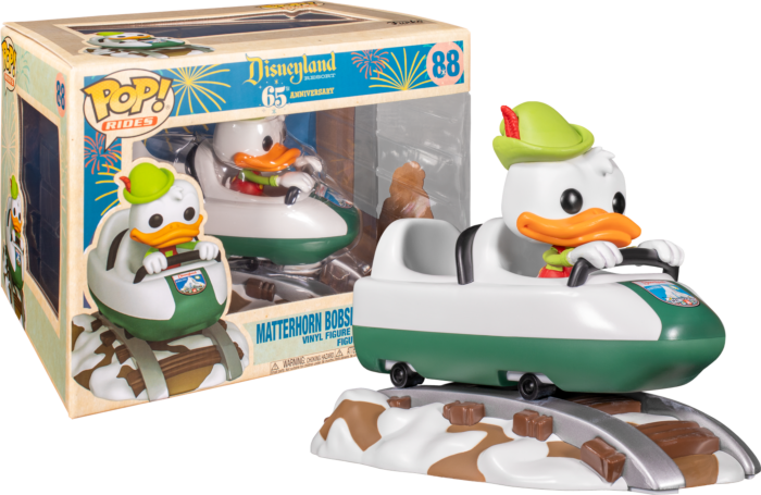 Introducing the Disneyland 65th Anniversary - Donald on Matterhorn Pop! Ride, a delightful collectible that celebrates the iconic Disneyland attraction and the beloved character Donald Duck. Inspired by the thrilling Matterhorn Bobsleds ride, this Pop! Ride features Donald Duck seated in a bobsled, ready for an exciting adventure. With his classic sailor hat and a determined expression, Donald brings his signature charm and mischievousness to this intricately detailed figurine. This special edition Pop! Ride commemorates the rich history and enduring magic of Disneyland, capturing the nostalgia and excitement that have made it a beloved destination for generations. Whether you're a fan of Donald Duck, the Matterhorn ride, or simply cherish the memories of visiting Disneyland, this Pop! Ride is a must-have addition to your Disney collection. Bring a piece of the Disneyland 65th Anniversary celebration into your home and let Donald Duck and the Matterhorn transport you to the enchanting world of Disney.