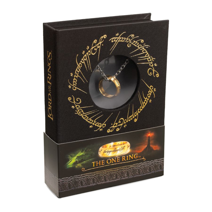 An anodised stainless steel One Ring on a chain, perfect for hiding under clothes to keep away from the prying Eye of Sauron. Each ring features a laser etched inscription of the One Ring verse. The ring is presented in a black Lord of the Rings gift box. This ring is only available in US Size 10, for other sizes see One Ring Stainless Steel - Gold (without chain) Please note all dimensions under Information refer to the boxed product.