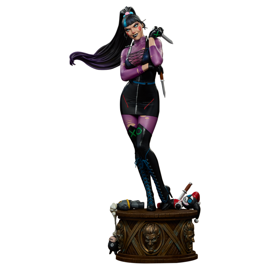It’s a mad world, and she’s the solution. The Punchline Premium Format Figure measures 21.75 inches (55.2 centimeters) tall, 11.14 inches (28.2 centimeters) wide, and 8.1 inches (20.5 centimeters) deep as Alexis Kaye carves out a place for herself within the coterie of Gotham City baddies. Both a lover and a hater, she takes her costume and makeup cues from The Joker while torturing torn toy versions of Harley Quinn and Batman - hey, every fangirl needs a hobby.