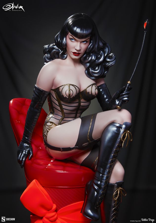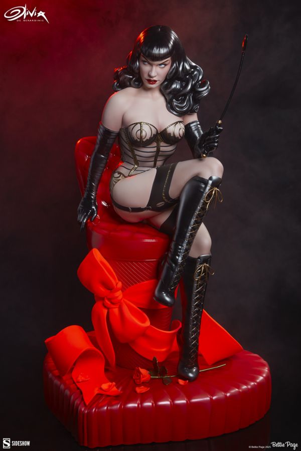"I was never the girl next door." - Bettie Page Sideshow presents the Bettie Page: Love Hurts Statue, designed and sculpted by world-renowned pinup artist Olivia De Berardinis and based on her original art print of the same name. Love Hurts is Olivia's scintillating three-dimensional tribute to the one and only "Queen of Pinups" Bettie Page. A pioneer of the bondage modeling scene, the iconic domme sits poised atop a glossy red platform stiletto heel wrapped in a matching matte bow. Page's cheeky pose flaunts her stern and sultry side, with a riding crop at the ready to show you why they really call it a "heartbeat." A crushed rose beneath her boot serves as an added reminder that romance isn't all kisses, candy, and flowers. The fully sculpted polystone Bettie Page: Love Hurts Statue measures 17" tall x 10.7" wide x 9.7" deep, with a base inspired by a vintage heart-shaped chocolate box. A variety of luxe paint applications recreate the material looks of leather, vinyl, and matte fabric against the curvaceous model's soft complexion, making this statue a feast for the senses. Page's signature hairstyle is also highlighted with vibrant black gloss, emphasizing every luscious curl that cascades over her bare shoulders. Delicate lace, garters, and corset boning details complete her black and gold bondage-chic look, inviting you into a scene of pure sensuality. Two legends of the pinup scene in one essential collectible!