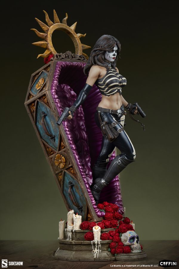 "Tomorrow, I'll pray for my soul." Sideshow presents the La Muerta Premium Format Figure, an officially licensed statue featuring one of the legendary ladies of Coffin Comics. The La Muerta Premium Format Figure measures 24" tall, 11.5" wide, and 12.4" deep as Maria Diaz resurrects her inner spirit of war. Trading in a peaceful life for vengeful retribution, Maria wields dual pistols and dons the disguise of La Muerta, a vigilante hell-bent on destroying all criminals even at the cost of her humanity. Her skeletal Dia de los Muertos face paint, black clothing, and steely gaze are a warning to the death-worshipping cartel that plagues her city. This fully sculpted Coffin Comics collectible showcases a beautiful, deadly soldier in pursuit of her enemies. Wearing a leather crop top, low rise pants, and matching accessories, La Muerta steps out of a purple velvet-lined coffin onto an altar covered with dripping candles, red roses, and a decorated calavera. The coffin itself features a dazzling sun piece, realistic wood texture, and a cloaked figure on the back seen praying for the damned. No soul is safe - not even her own.