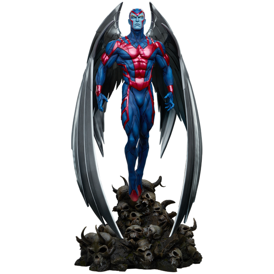 "Destroy yourselves...destroy each other. I can always watch it from above." Sideshow presents the Archangel Premium Format Figure. This divine Marvel collectible emphasizes the darker nature of mutantkind. Savior, killer, harbinger of hope or destruction. The Archangel Premium Format figure measures 28.75" tall, 16.8" wide, and 13.37" deep as Warren Worthington III hovers above a pile of infernal skulls. With his razor-sharp metal wings folded around his body like armor, Apocalypse's lethal henchman surveys a battlefield rife with monsters and death. He is unstoppable as an instrument of evil - but his ascension came at the cost of his fall from grace. This fully sculpted X-Men collectible depicts Warren Worthington III after his transformation into the Eternal One's Horseman of Death. He wears his classic blue and magenta costume over blue skin, a drastic color change brought on by extensive genetic alterations. Stripped of his own wings, four sets of poisonous blades instead protrude from Archangel's back and shoulders as he flies above a base created from demonic bones. The Archangel Premium Format Figure features three swap-out portraits, including a cowled head, a head with the character's gold Death mask, and an unmasked head showcasing Warren's loose blonde curls. Each option increases the range of display, allowing fans to explore various steps in Archangel's journey through rage, revenge, and redemption.
