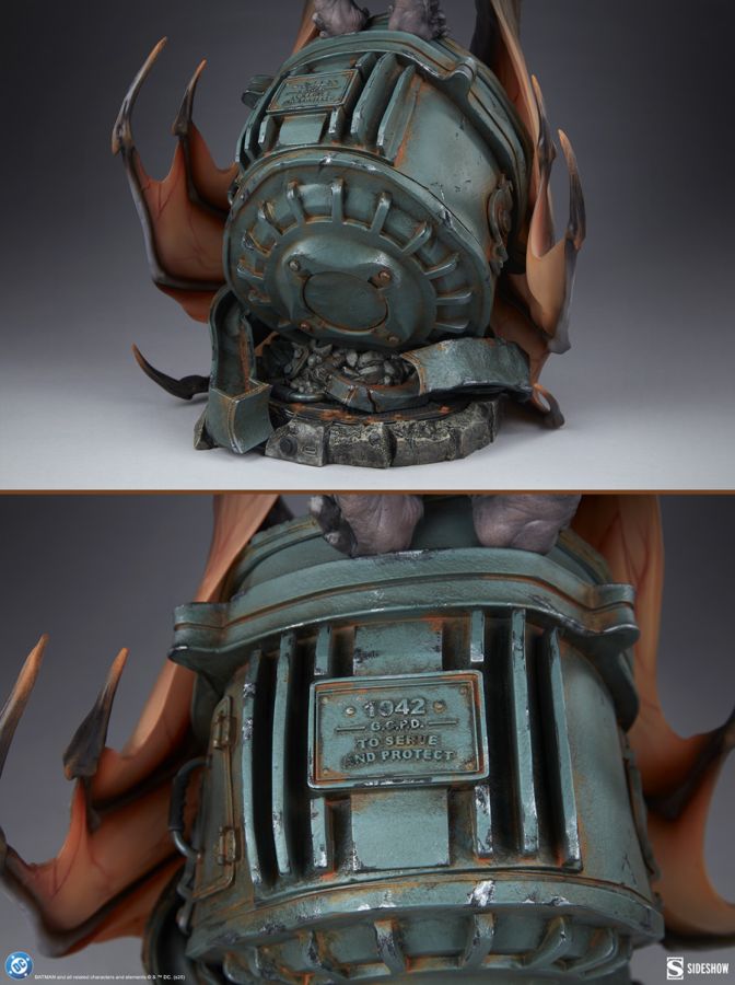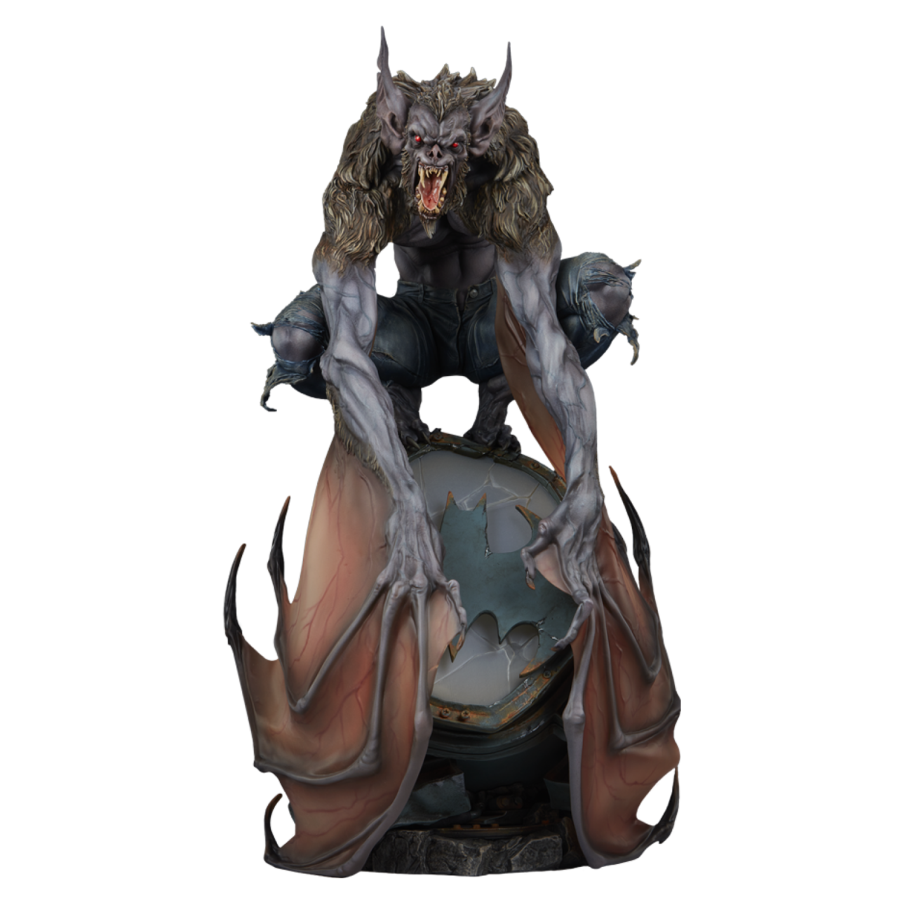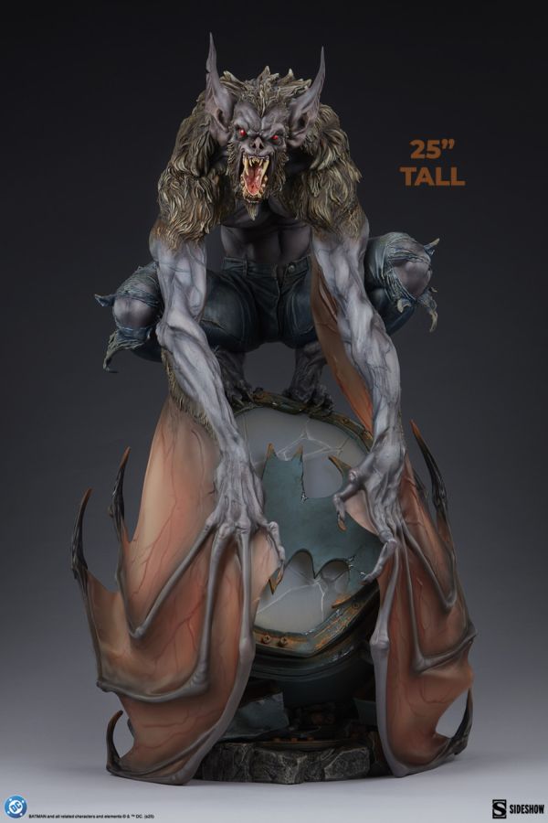 Sideshow presents the Man-Bat Premium Format Figure, a frightful DC collectible that depicts a rampaging rogue let loose upon the skies of Gotham City. The Man-Bat Premium Format Figure measures 25 inches (63.5 cm) tall, 14.8 inches (36.8 cm) wide, and 13.6 inches (34.6 cm) as this villain perches menacingly on a damaged Bat-Signal. Screeching, the creature beats his sinewy wings against shattered glass and crushed metal. His piercing red eyes have eclipsed all reason and humanity, leaving only a feral thing made of fur, teeth, and fury. This fully sculpted Man-Bat collectible showcases scientist Kirk Langstrom after injecting himself with an experimental serum. Humanoid yet decidedly inhuman, Man-Bat cuts a massive and frightening figure with protruding ears, pointed fangs, and elongated claws. The DC statues base features an industrial distress beacon from Gotham PDs rooftop, engraved with a numerical Easter egg for the most discerning DC fans. Behind Batmans insignia, the signal also has a light-up feature which can either shine white to call the Dark Knight or bathe the scene in preternatural blood-red - an otherworldly ambiance well-suited to this tragic and terrifying character.